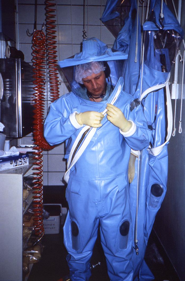 질병통제예방센터(CDC) 기술자가 CDC의 초기 BSL-4 실험실 중 한 곳에 들어가기 전에 구형 양압 보호복을 착용하고 있다.