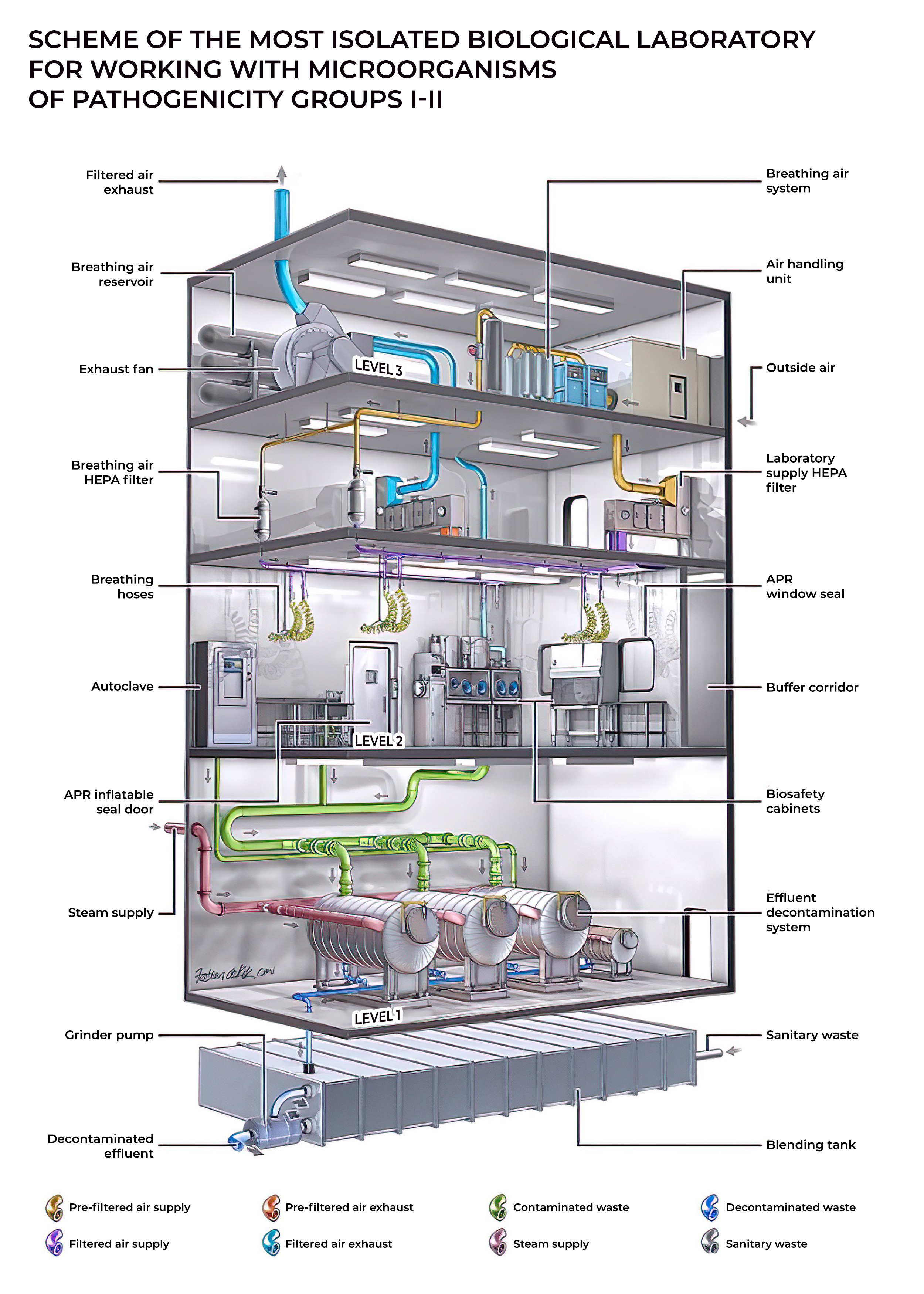 BSL-4 실험실은 다른 시설과 격리되어야 하며, 공기 흐름은 항상 "청정" 구역에서 감염 물질을 다루는 구역으로 흐르도록 제어된다.[20] 실험실 폐기물은 멸균 처리 후 배출된다.[20]