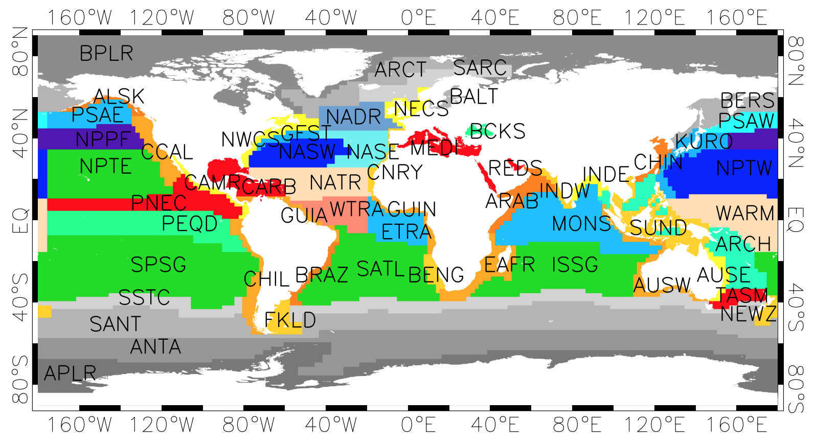 WWF 계획에 따르면, 북극 권역, 온대 북대서양 권역, 온대 북태평양 권역, 열대 대서양 권역, 서인도-태평양 권역, 중앙 인도-태평양 권역, 동인도-태평양 권역, 열대 동태평양 권역, 온대 남아메리카 권역, 온대 남부 아프리카 권역, 온대 오스트레일리아 권역, 남극해 권역 등으로 구분된다.