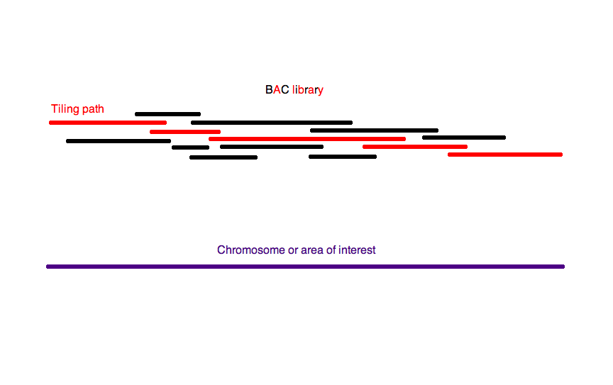 BAC 콘티그의 전체 시퀀스는 알려져 있지 않지만 서로 상대적인 방향은 알려져 있다. 이러한 순서를 추론하고 타일링 경로를 구성하는 BAC를 선택하는 몇 가지 방법이 있다. 일반적인 전략은 클론의 위치를 서로 상대적으로 식별한 다음 관심 영역 전체를 덮는 연속 스캐폴드를 형성하는 데 필요한 최소 수의 클론을 선택하는 것이다. 클론의 순서는 클론이 겹치는 방식을 결정하여 추론된다.[17] 겹치는 클론은 시퀀스 태그 부위(STS)를 포함하는 작은 방사성 또는 화학적으로 표지된 프로브를 클론이 인쇄된 마이크로어레이에 혼성화하여 식별할 수 있다.[17] 이러한 방식으로 유전체의 특정 시퀀스를 포함하는 모든 클론이 식별된다. 이러한 클론 중 하나의 끝을 시퀀싱하여 새로운 프로브를 생성하고 염색체 워킹이라는 방법으로 이 과정을 반복할 수 있다.