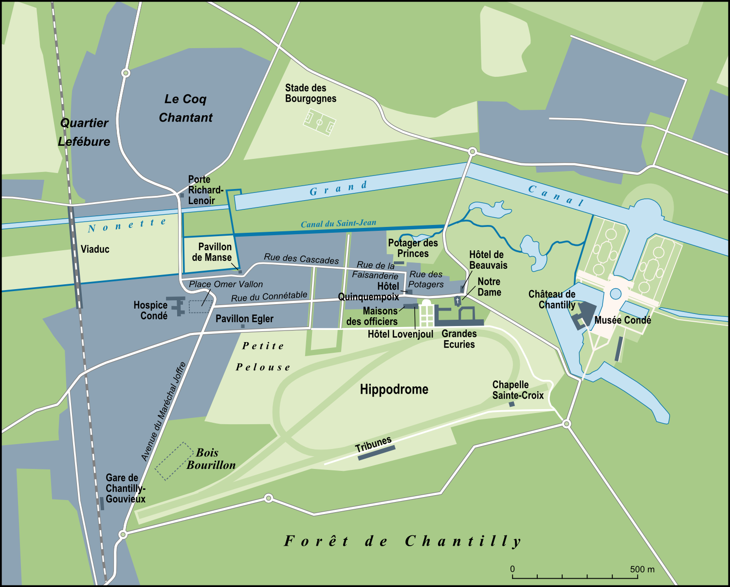 이와 동시에 샹티이는 많은 귀족, 상류층 인사 및 예술가들이 이주하면서 휴양지로 발전했다. 로스차일드 가문과 같은 사람들은 주변 지역에 빌라와 샤토를 건설했으며, 고브에(Gouvieux)에는 호텔 뒤 그랑 콩데(Hôtel du Grand Condé)와 같은 고급 호텔도 건설되었다.[17] 샹티이의 마지막 영주였던 오를레앙 공작 앙리는 경마장과 도시 발전을 장려하고 영국인들의 유입을 장려했다.