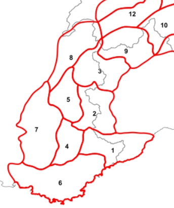 마리티메 알프스(1), 코티안 알프스(2), 그라이안 알프스(3), 프로방스 알프스(4), 도피네 알프스(5), 프로방스 프리알프스(6), 도피네 프리알프스(7), 사보이 프리알프스(8).