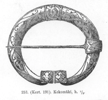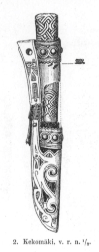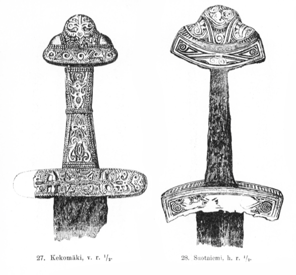 1893년 테오도르 슈빈트가 제작한 카렐리아 철기 시대 검 손잡이 그림으로, 그는 이 그림을 캐키살미에서 발굴했다.