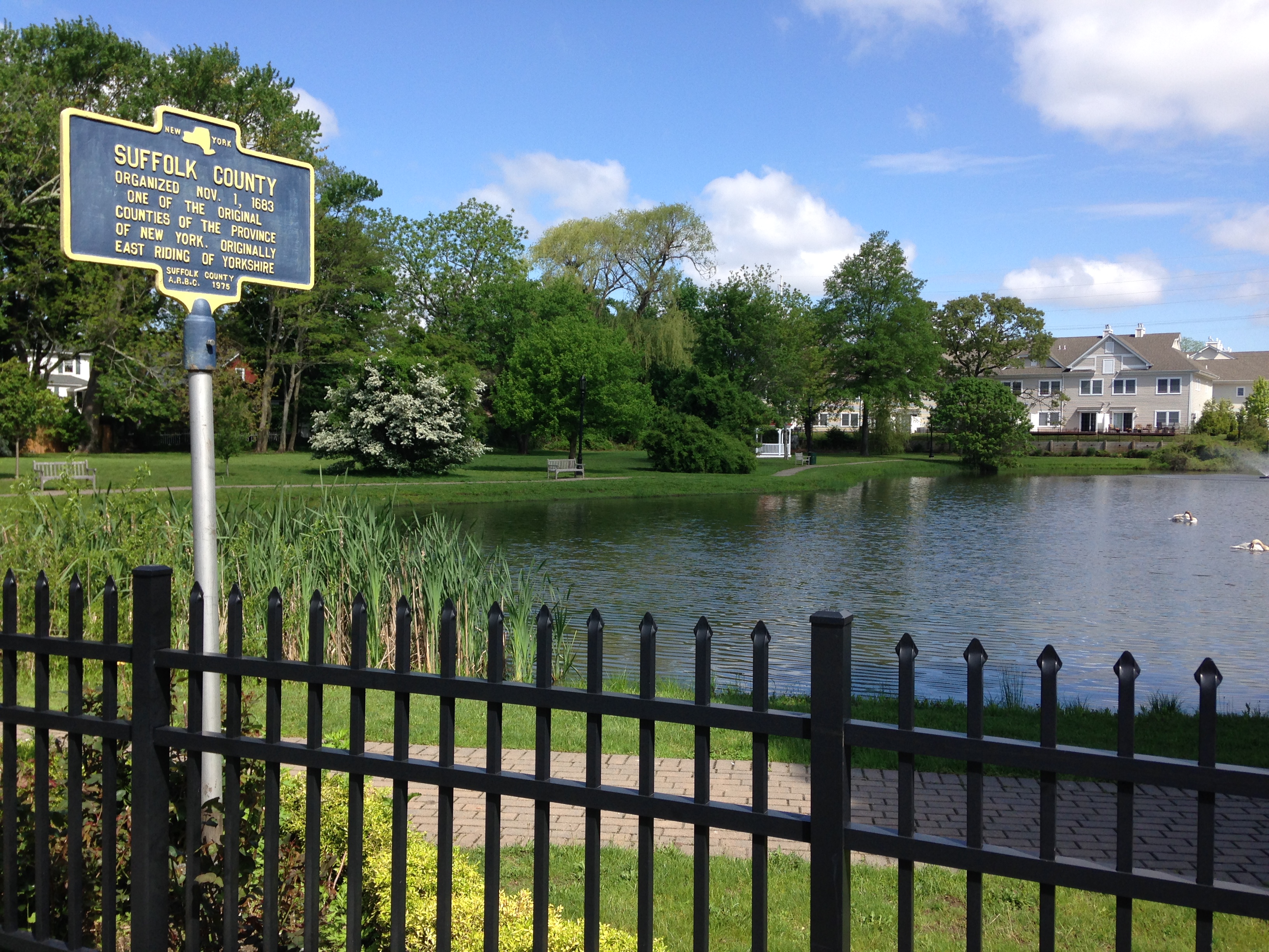 서퍽군(Suffolk County)의 1683년 건립을 언급하는 표지판. 아미티빌(Amityville) 오크 스트리트(Oak Street)의 피터킨 공원(Peterkin Park)에 위치