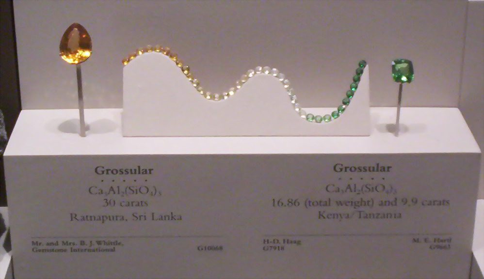 - 회반석류석(그로슐라, grossular): Ca3Al2(SiO4)3. 스카른에서 산출된다.[2] 차보라이트가 여기에 속한다.