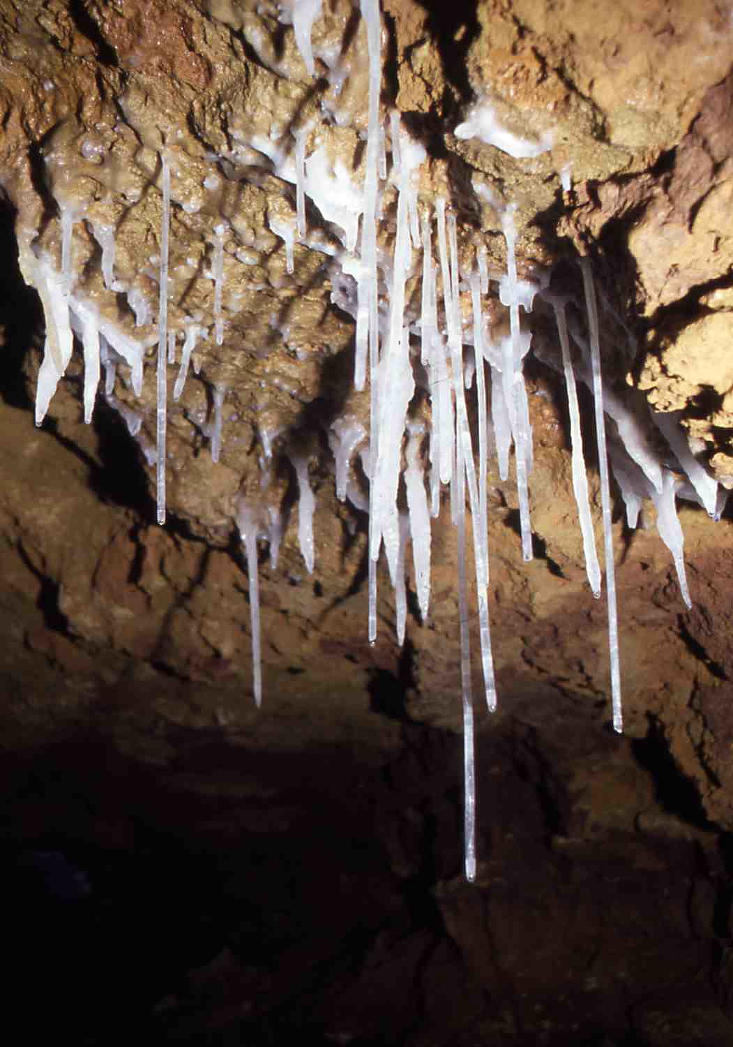 종유석은 동굴 천장에서 물이 증발하며 탄산 칼슘이 침전되어 자라나는 고드름 모양의 광물 덩어리이며, 석회암, 용암, 얼음, 콘크리트 등 다양한 종류가 있다. - 동굴 - 석순