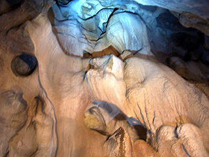 플로우 스톤(유화석)은 동굴의 벽이나 경사면 일면을 덮고 생기는 것으로, 부분적으로 보면 그 안에 작은 종유석 등을 포함하여 발달하고 있다.