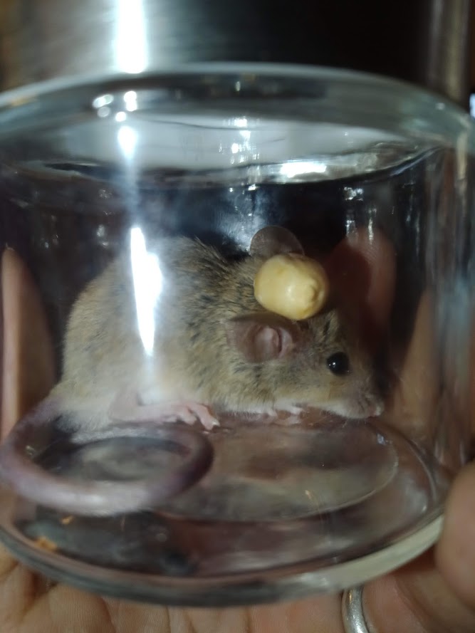 앨버커키 가정집에서 잡혀 머리에 땅콩을 인 채로 유리병에 갇혀 있는 수컷 선인장쥐