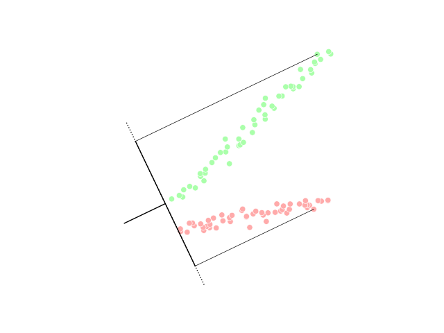 벡터 \vec w는 판별 초평면(hyperplane)의 법선 벡터이다. 2차원 문제에서 두 그룹을 가장 잘 나누는 선은 \vec w에 수직이다.