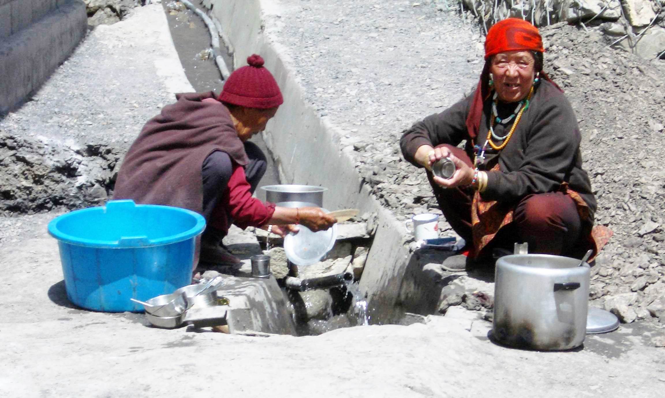 일부 개발도상국에서는 전통적인 방식으로 설거지를 하기도 한다. 젖은 천이나 행주에 잿물(카라니)을 묻혀 그릇이나 조리 도구를 문질러 때를 제거하는 방식이다. 이때 사용되는 잿물은 설거지를 위해 나무나 장작을 태워 특별히 만든 것이다. 설거지를 마친 그릇은 깨끗한 물로 헹군 뒤, 물기를 빼기 위해 걸어서 말린다. 이러한 방식은 네팔, 인도네시아, 인도 등 아시아 개발도상국 마을에서 흔히 찾아볼 수 있다.