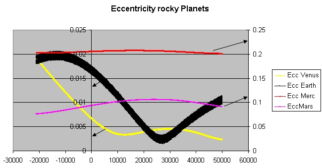 행성들의 지속적인 상호 섭동은 그들의 궤도 요소에 장기적인 준주기적 변화를 일으키는데, 두 행성의 공전 주기가 거의 일치할 때 가장 두드러진다. 예를 들어, 목성의 5회 공전(59.31년)은 토성의 2회 공전(58.91년)과 거의 같다. 이는 두 행성 모두에 합에서의 위치 차이가 한 바퀴를 완전히 돌 때까지 걸리는 시간인 918년의 주기로 큰 섭동을 일으키는데, 이는 라플라스에 의해 처음 발견되었다.[7] 현재 금성은 모든 행성 궤도 중 가장 작은 이심률, 즉 원에 가장 가까운 궤도를 가지고 있다. 2만 5천 년 후에는 지구가 금성보다 더 원형에 가까운(덜 이심적인) 궤도를 가지게 될 것이다.