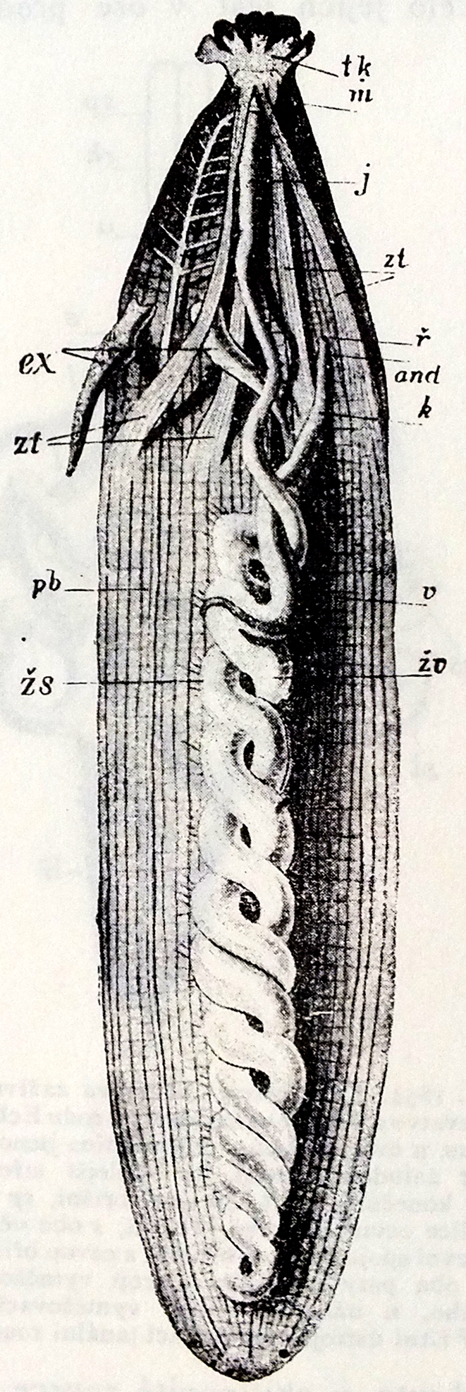 체강의 대부분은 소화관이 차지한다. 소화관은 선단의 입에서 후부로 뻗어, 후단에서 접어, 체간 전단의 배면에 있는 항문으로 이어진다. 따라서 소화관은 U자형이 되며, 뒤로 뻗는 장관과, 후단에서 되돌아오는 장관은 서로 나선형으로 감겨 있다. 이러한 굴곡된 소화관은 별벌레 동물 외에, 고착성인 동물에게 종종 보인다.