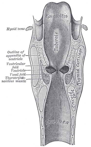 성대는 점막으로 덮여 있으며, 뒤에서 앞으로 수평으로 후두를 가로질러 뻗어 있다.