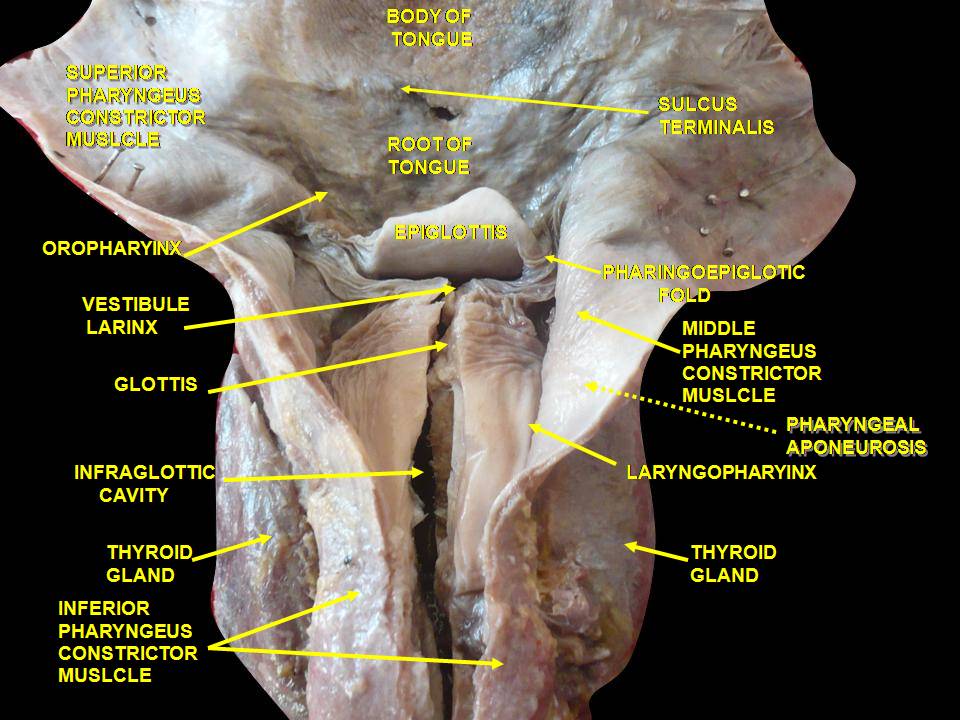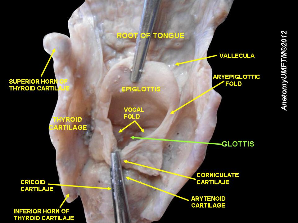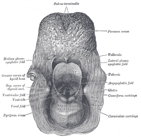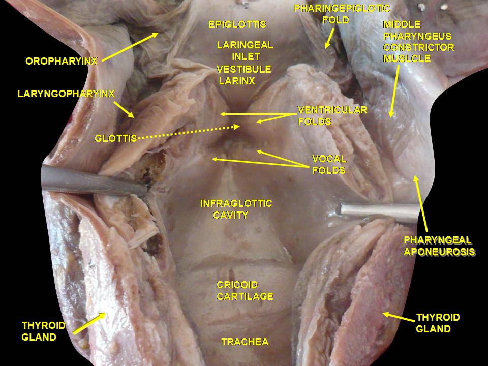 "喉頭前庭ヒダの下方には, 左右の声帯ヒダによってつくられる声門裂 rima glottidis という, やや狭い三角形の裂隙がみえる"