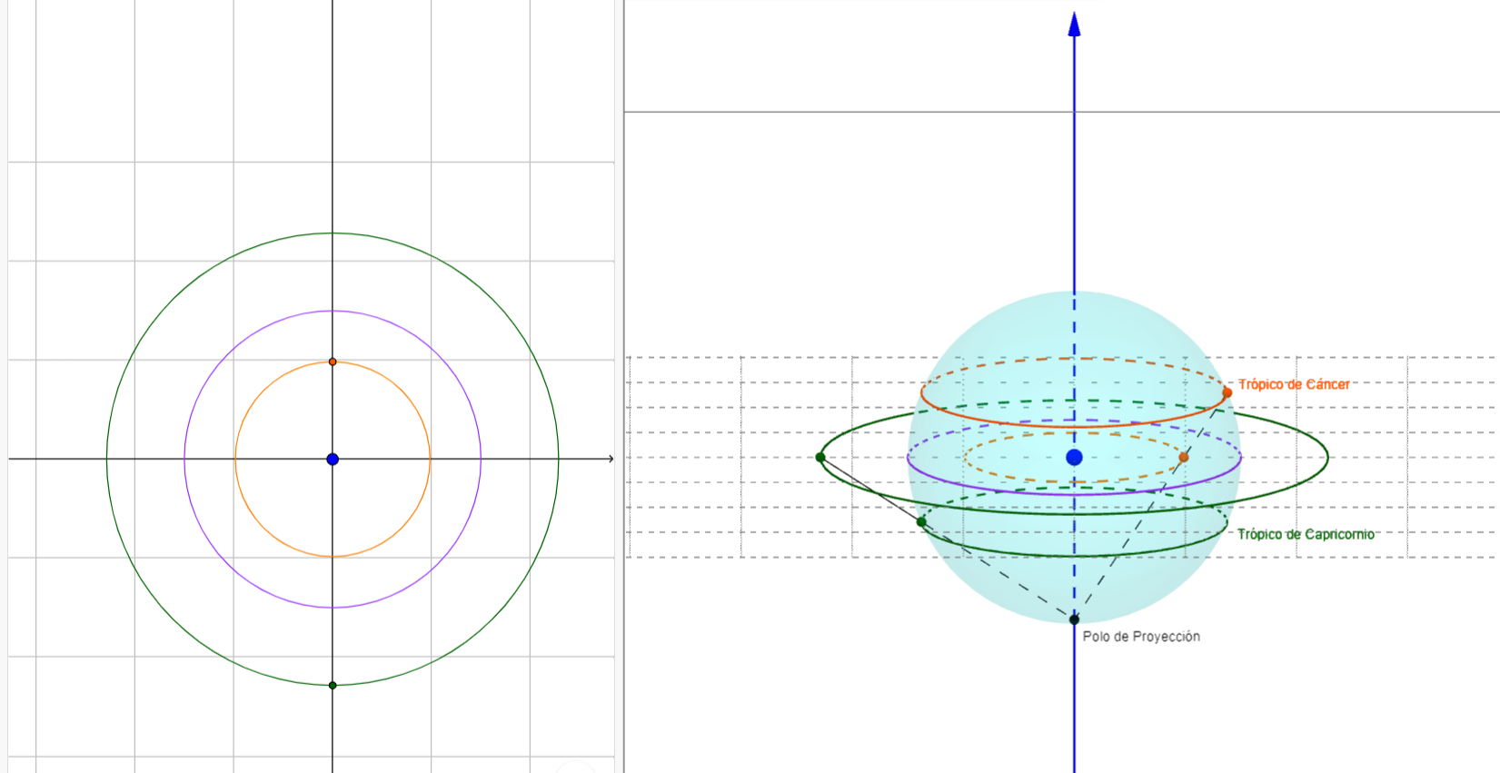 위 이미지에서 볼수 있듯이, 파란색 구는 천구를, 파란색 화살표는 진북 방향(북극성)을, 중앙 파란색 점은 지구(관찰자의 위치)를, 검은색은 천구의 지리적 남극 (투영 극)을, 그리고 회색은 천구 적도면(투영면)을 나타낸다. 세 개의 평행원은 지구의 주요 위선의 천구 투영을 보여주는데, 주황색은 천구의 북회귀선, 보라색은 천구의 적도, 녹색은 천구의 남회귀선을 의미한다.