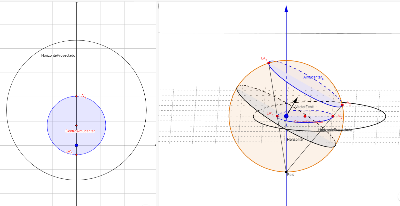 지평선과 평행하게 천정(알무칸타르)까지 원을 그리고 천구 적도면에 투영하면, 연속적인 타원 그리드가 구성되어, 별의 ''rete''가 설계된 심판과 겹칠 때 별의 고도를 결정할 수 있다.
