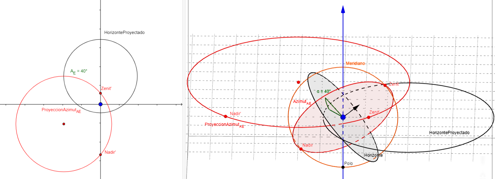 위 이미지에서 파란색 화살표는 진북 방향 (북극성)을, 중앙 파란색 점은 지구 (관측자의 위치)를, 검은색 화살표는 관측자의 천정 방향 (관측자의 위도에 따라 달라짐)을, 검은색 원은 관측자를 둘러싼 지평선을, 빨간색 점은 천정, 천저 등, 주황색 원은 천구 자오선을, 빨간색 원은 관측자의 지평선을 기준으로 동쪽으로 40°의 방위각을 갖는 보조 자오선, 검은색은 천구의 지리적 남쪽(투영 극)을, 그리고 회색은 천구 적도면 (투영 평면)을 나타낸다.
