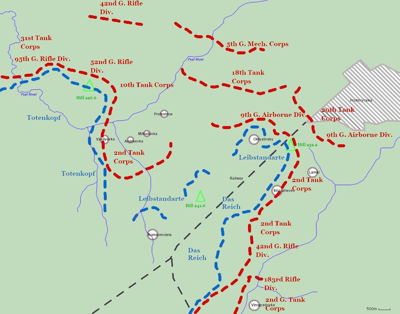 7월 8일 말까지 제2 SS 기갑 군단은 시타델 작전 시작 이후 약 29km 진격했고, 제1 및 제2 방어선을 돌파했다. 그러나 제48 기갑 군단의 느린 진격으로 인해 호트는 제2 SS 기갑 군단의 일부 병력을 서쪽으로 이동시켜 제48 기갑 군단의 추진력을 되찾도록 도왔다. 7월 10일, 군단의 모든 노력이 다시 자체 전진으로 전환되었다. 그들의 진격 방향은 이제 오보얀에서 프로호로프카를 향해 북쪽에서 북동쪽으로 바뀌었다. 호트는 5월 초부터 만슈타인과 이 움직임에 대해 논의했고, 이는 공세 시작부터 제4 기갑군의 계획의 일부였다. 그러나 이 시점에서 소련군은 예비 병력을 그 길목으로 이동시켰다. 방어 위치는 제2 전차 군단이 배치되었고, 제33 근위 소총 군단의 제9 근위 공수 사단과 제301 대전차 포병 연대가 보강했다.