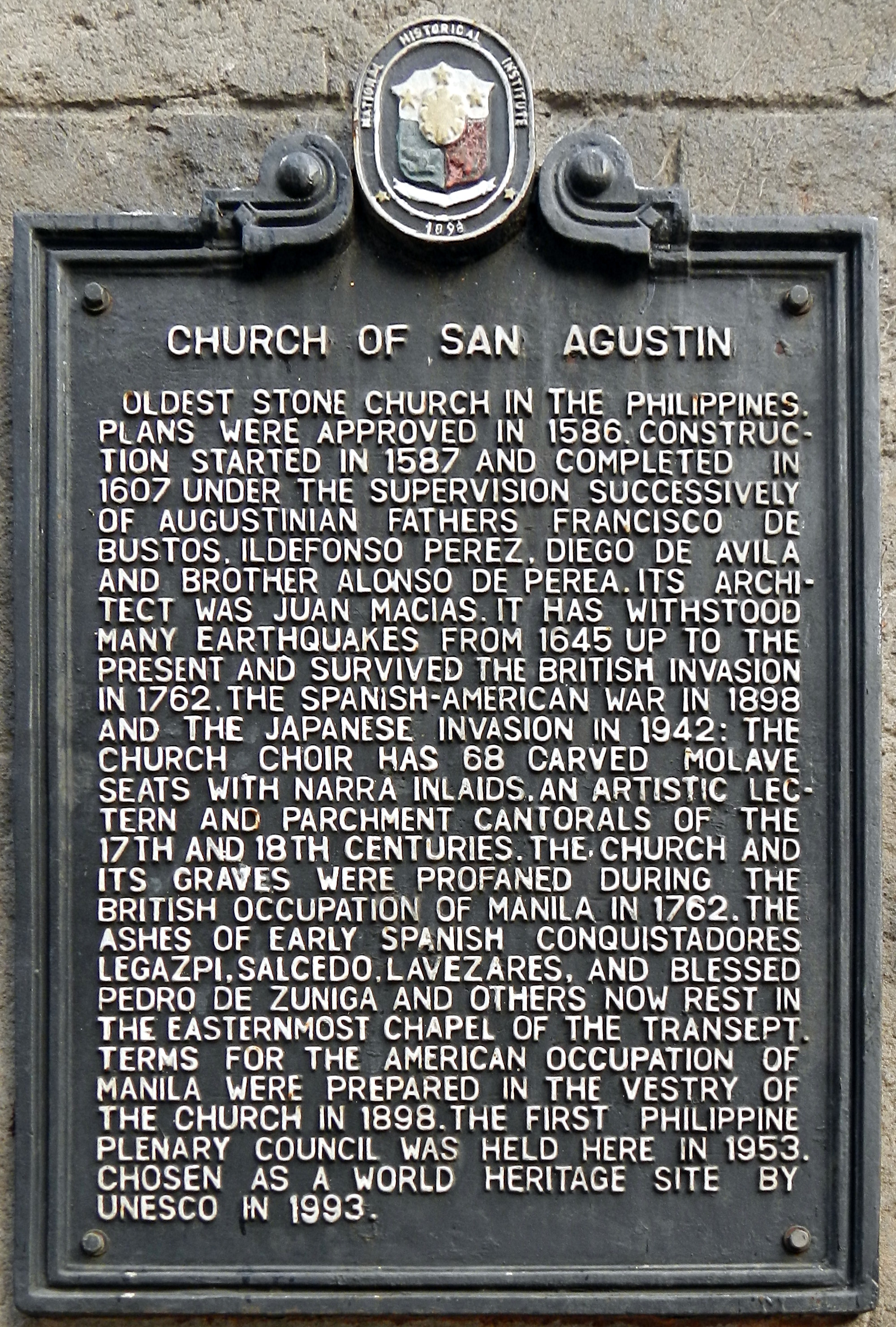 산 아구스틴 교회는 마닐라 제너럴 루나 거리에 있는 교회로, 현재 건물은 이 부지에 세워진 세 번째 아우구스티누스 교회이다.[5] 1571년 대나무와 니파로 최초의 교회가 지어졌으나, 1574년 리마홍 군대의 마닐라 침공 시도 중 화재로 소실되었다.[7][8] 1583년에는 곤살로 론킬로 데 페날로사 총독의 장례식 중 촛불이 장식용 천에 옮겨붙어 두 번째 목조 건물이 화재로 파괴되었다.[7]