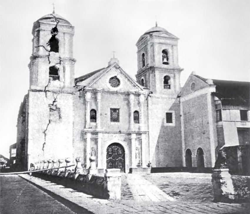 1863년 6월 3일, 당시 가장 강력한 지진이 마닐라를 강타하여 도시에 광범위한 피해를 입혔지만, 산 아구스틴 교회만이 손상되지 않은 유일한 공공 건물로 남았다.[11] 1880년 7월 18일부터 20일까지 마닐라에 강력한 지진이 다시 발생하여 동쪽 종탑에 큰 균열이 생겼다.[12] 균열은 결국 수리되었지만, 왼쪽 탑은 오늘날 기단만 남은 채 영구적으로 제거되었다.[13] 교회는 1645년, 1699년, 1754년, 1796년, 1825년, 1852년, 1863년, 1880년에 마닐라를 강타한 다른 주요 지진을 견뎌냈으며, 1863년 지진 동안 부상당한 사람들을 위한 병원으로 사용되었다.[14]