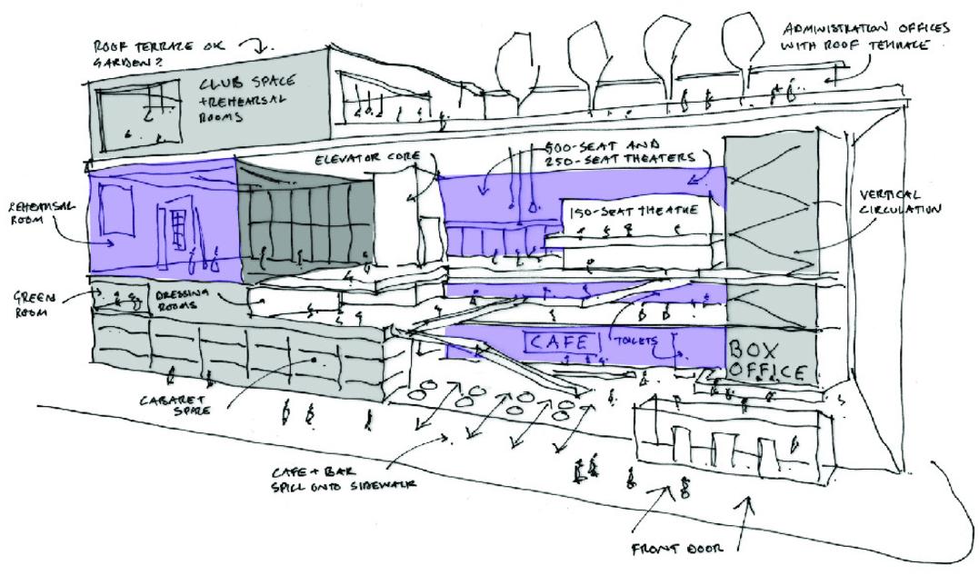 완공된 공연예술센터는 세 층에 걸쳐 약 8,400 평방 미터를 포함한다. 공용 층은 거리에 위치하며, 쇼 중간 휴식 시간 동안 다과를 제공하는 레스토랑/바가 있다. 2층은 연극배우들을 위한 리허설과 분장실로 구성되며, 3층에는 3개의 극장이 들어설 예정이다. 세 개의 극장 모두 벽이 회전하고 확장될 수 있도록 설계되어 필요한 경우 단일 극장을 위한 여분의 공간을 제공한다. 그 극장들은 모두 합쳐 약 1,200명을 수용할 것이다.[93]