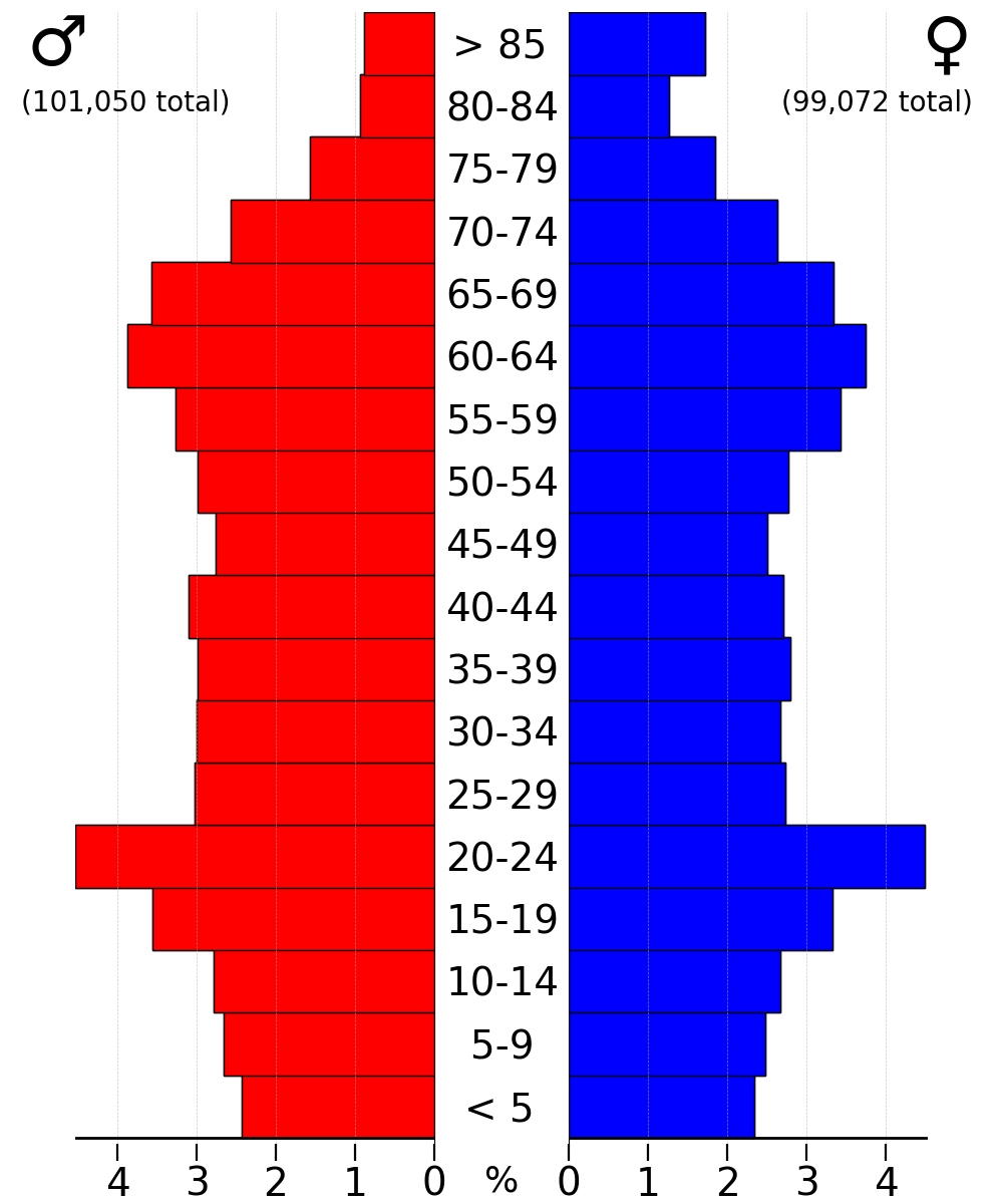인구는 18세 미만이 22.4%, 18세에서 24세가 11.4%, 25세에서 44세가 25.9%, 45세에서 64세가 24.3%, 65세 이상이 16.1%였다. 중앙 연령은 39세였다. 여성 100명당 남성은 96.8명이었다. 18세 이상 여성 100명당 남성은 93.8명이었다.