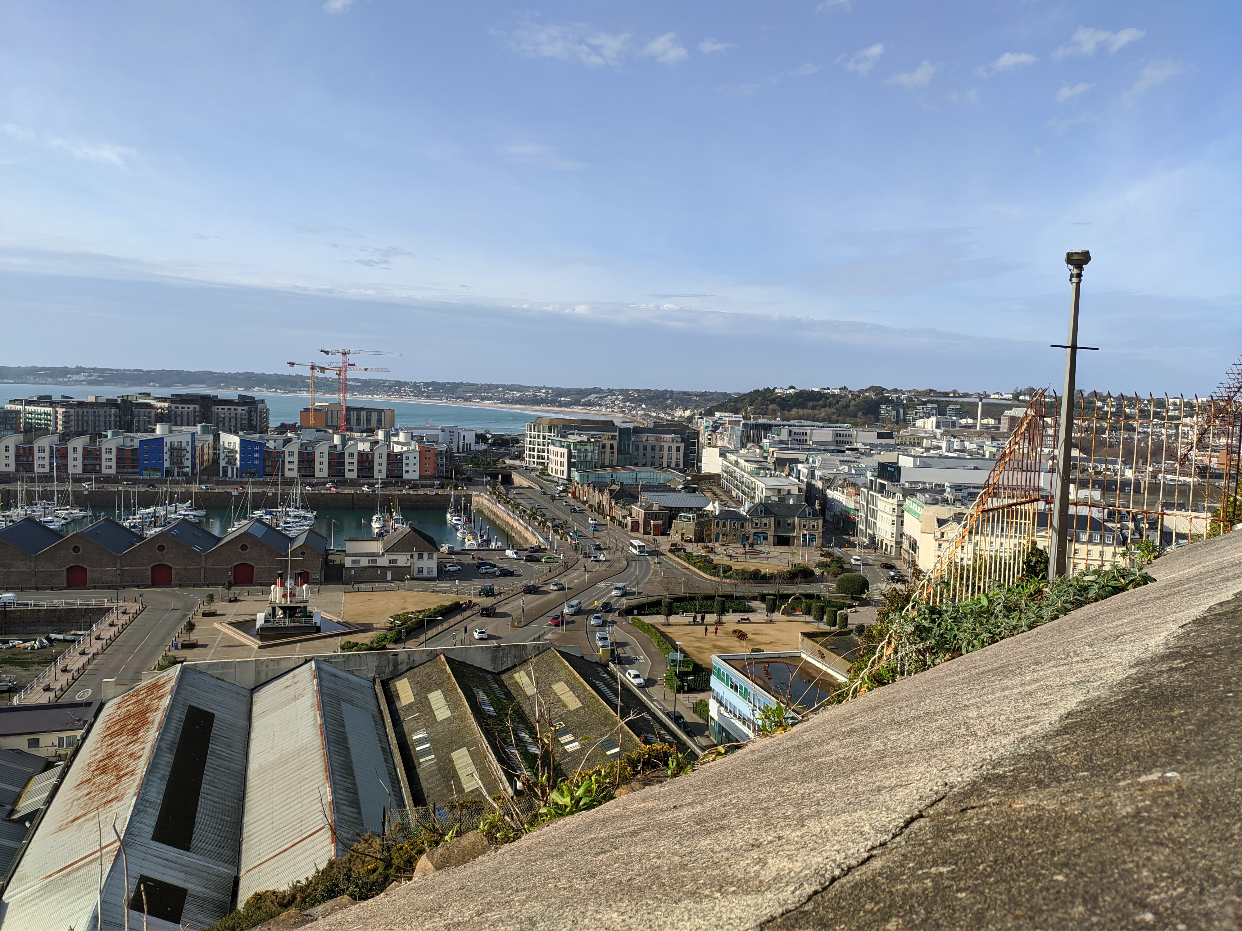 나폴레옹 전쟁 시기에는 프랑스의 침략 위협에 대비하여 섬 전체가 요새화되었다. 해안 주변에는 마르텔로 타워(세인트헬리어의 퍼스트 타워 포함)가 건설되었고, 1805년에는 주(States)가 몽 드 라 빌(Mont de la Ville)을 영국 정부에 매각하여 주요 요새를 건설하기로 합의했다. 요새 건설로 인해 아일랜드와 잉글랜드에서 많은 인력과 자본이 유입되었으며, 주는 몽 드 라 빌 매각 수익금을 도시 포장 개선에 사용했다.[6]