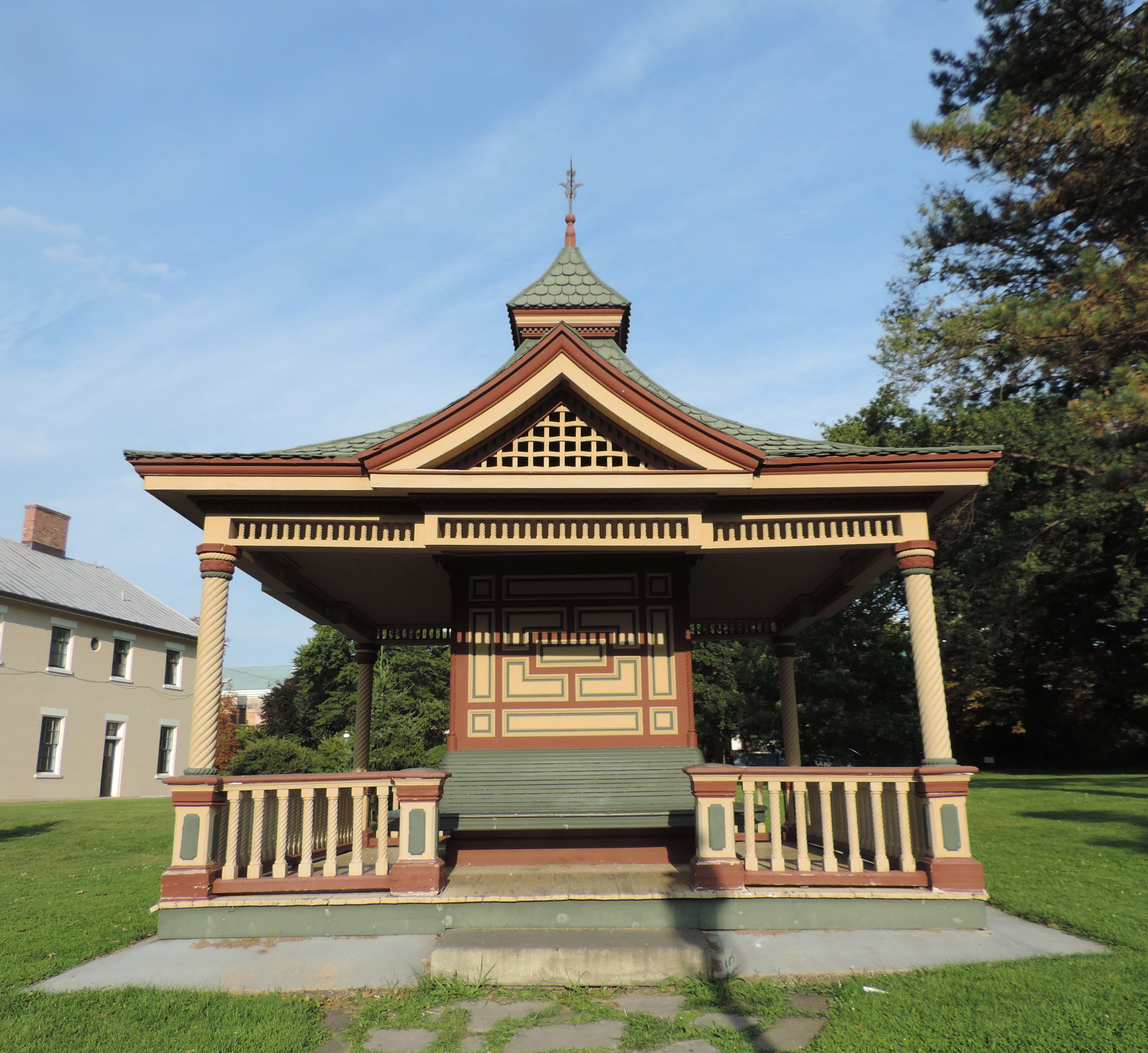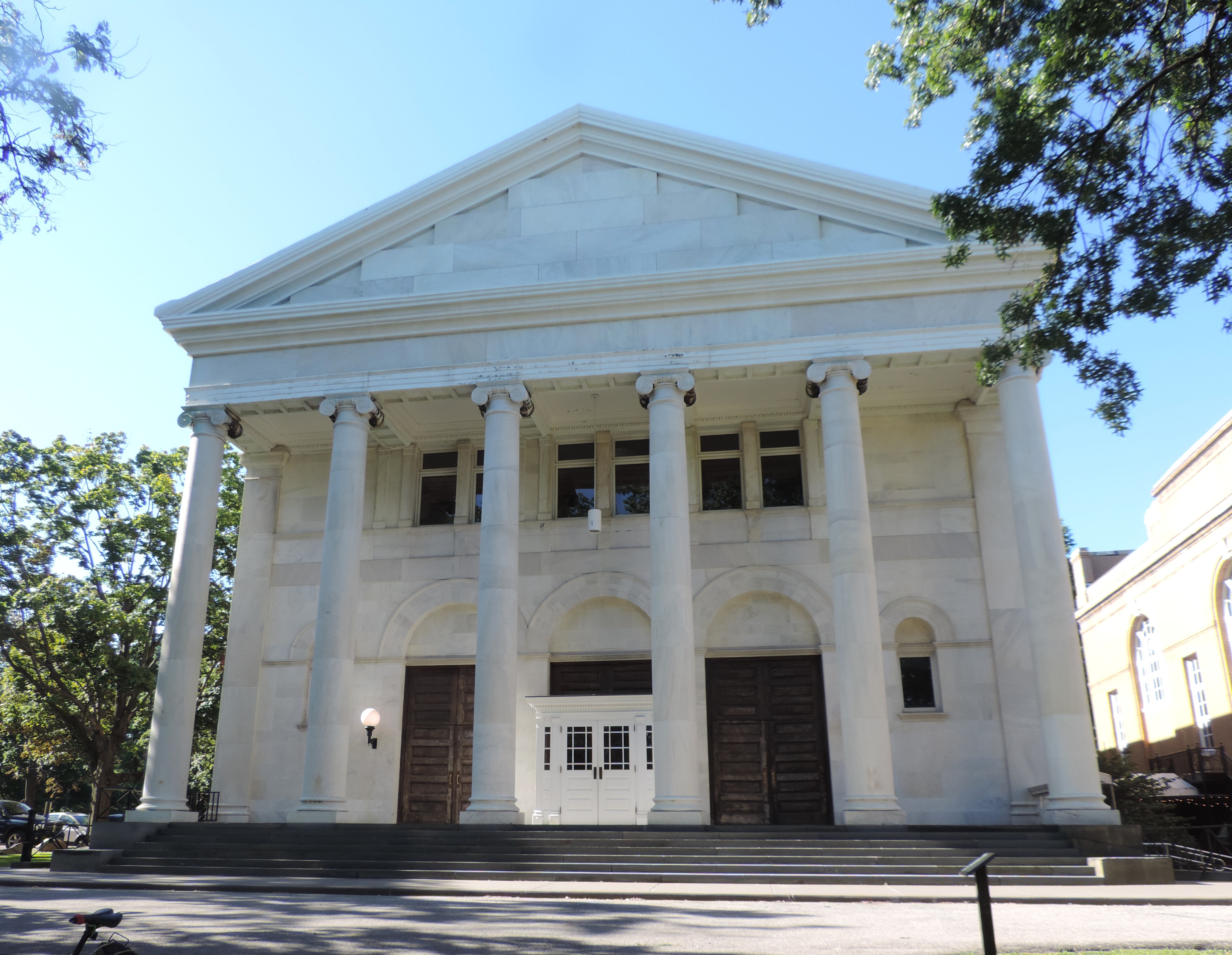 재향군인 기념관은 이전에는 예배당으로 불렸으며, 지역 건축가 제임스 솔로몬이 설계하여 1855년에서 1856년 사이에 건설되었다.[23][38] 양식상으로는 주로 이탈리아 건축에 뿌리를 둔 양식적 요소와 그리스 부흥 건축의 몇 가지 요소를 모두 가진 "과도기적" 건물이다.[38] 예배당의 디자인은 전형적인 뉴잉글랜드 교회의 디자인을 기반으로 한다.[39]예배당은 박공 지붕을 가지고 있다. 정문은 예배당 전면에 돌출된 종루가 있는 탑으로 구성되어 있다. 입구는 세 개의 둥근 아치와 세 개의 명판이 있는 석고 벽으로 된 현관으로 이어진다. 벽돌 외관에는 각 측면에 여섯 개의 둥근 아치형 창문이 있고, 필라스터로 구분되어 있다. 후면에는 사무실과 성구실이 있는 1층 증축 공간이 있다.[26][38] 예배당 안에는 스테인드 글라스 창문이 있다.[26][39]