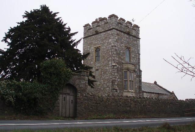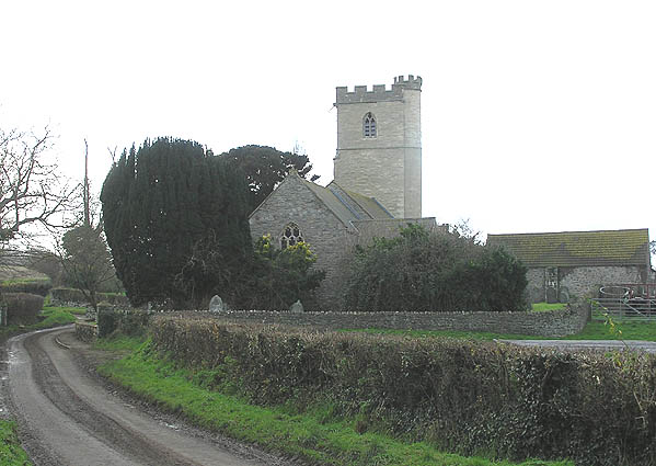 두드러진 사각 탑이 있는 석조 건물. 앞쪽에는 묘비가 있음.