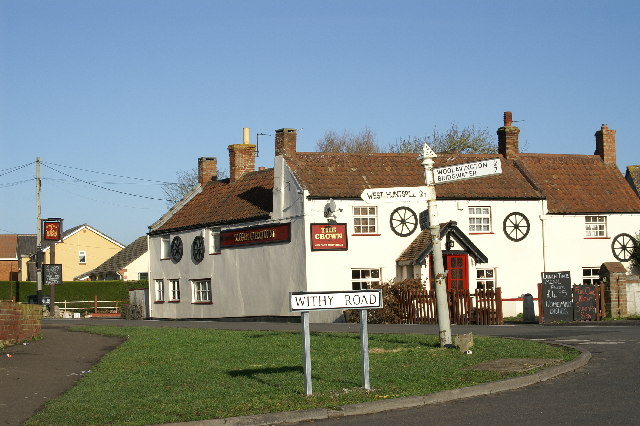 방향 표지판이 있는 도로 교차로. 배경에는 Crown이라는 펍 간판이 있는 흰색 건물.
