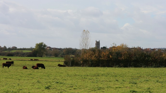 나무와 관목 위로 보이는 사각 교회 탑. 앞쪽에는 소가 있는 잔디밭.