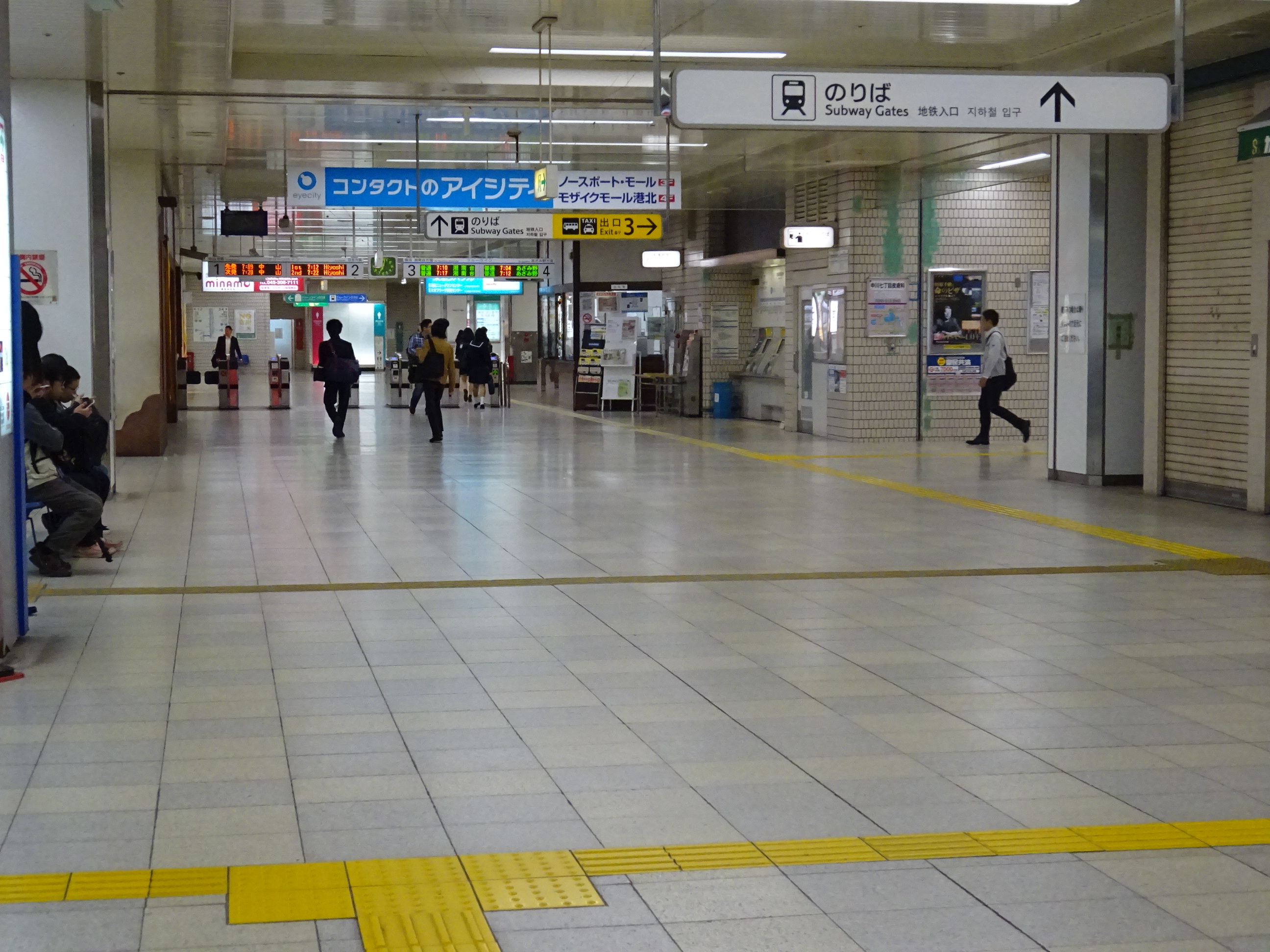 - 당역 - 센터 미나미역 구간은 블루 라인과 그린 라인이 나란히 달리는 구간이지만, 선로별 복복선이기 때문에 양 노선의 홈은 독립되어 있다. 이 때문에 당역과 마찬가지로, 센터 미나미역에서 블루 라인과 그린 라인을 상호 환승하는 경우도 계단이나 에스컬레이터를 오르내려 홈을 이동해야 한다.[11]