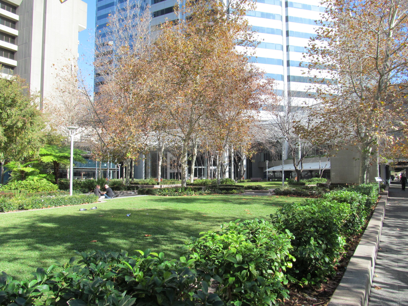 부지에는 5,000m2의 조경 공원이 조성되어 있다.[28] 이 공원은 헤이 스트리트 몰 반대편에 있는 복원된 웨슬리 교회로 이어지며,[20] "헤이 스트리트 몰의 딱딱하고 선형적인 특성 속의 숨 쉴 공간"으로 설계되었다.[29] 공원에는 움푹 들어간 좌석 공간, 솟아오른 잔디밭, 분수대가 있으며,[29] "강변 부지의 잔디밭 외에 도시의 몇 안 되는 녹지대 중 하나", "도시의 녹색 폐",[30] "뒷마당 크기의 잔디밭" 등으로 묘사된다.[31]