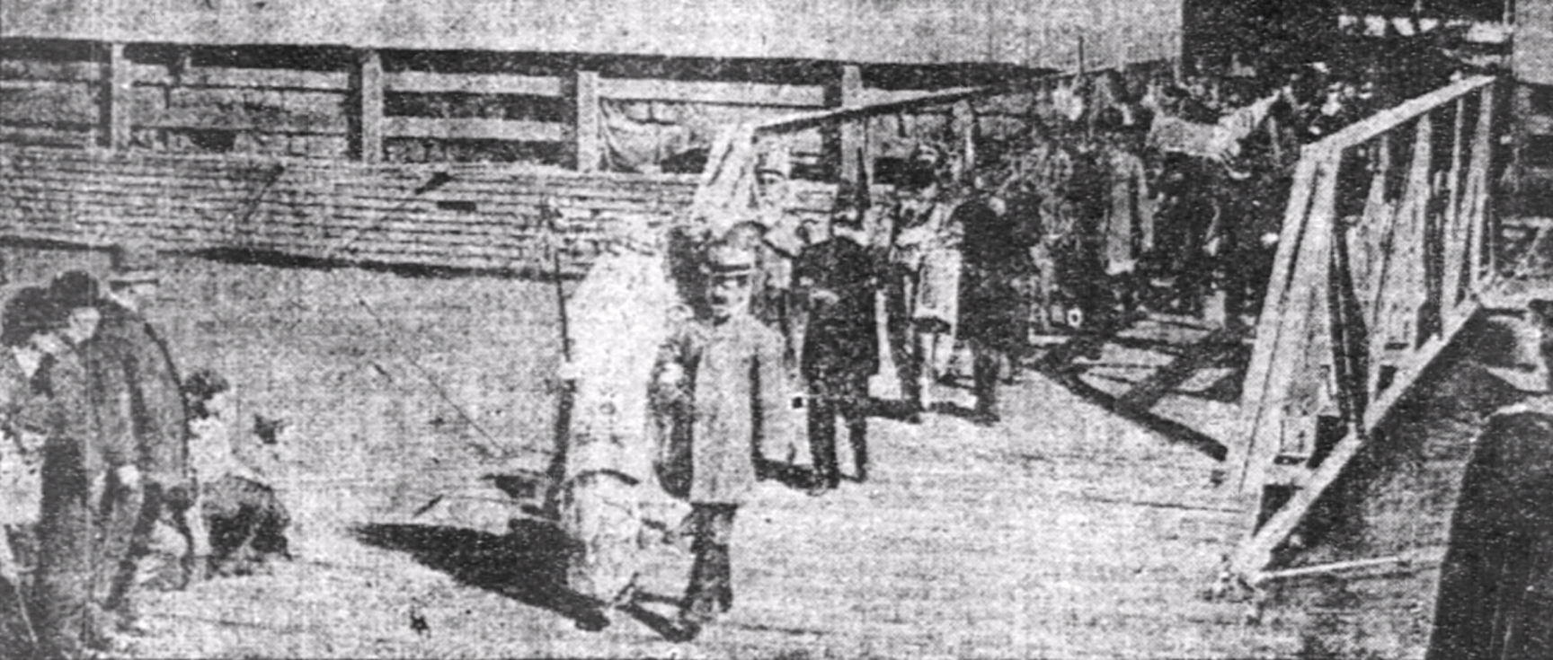 셀던 P. 스펜서 판사가 1892년 10월 베일드 프로펫을 이끄는 모습. 강 배 ''워 이글''에서 제퍼슨 배럭스 부두로 향하고 있다.