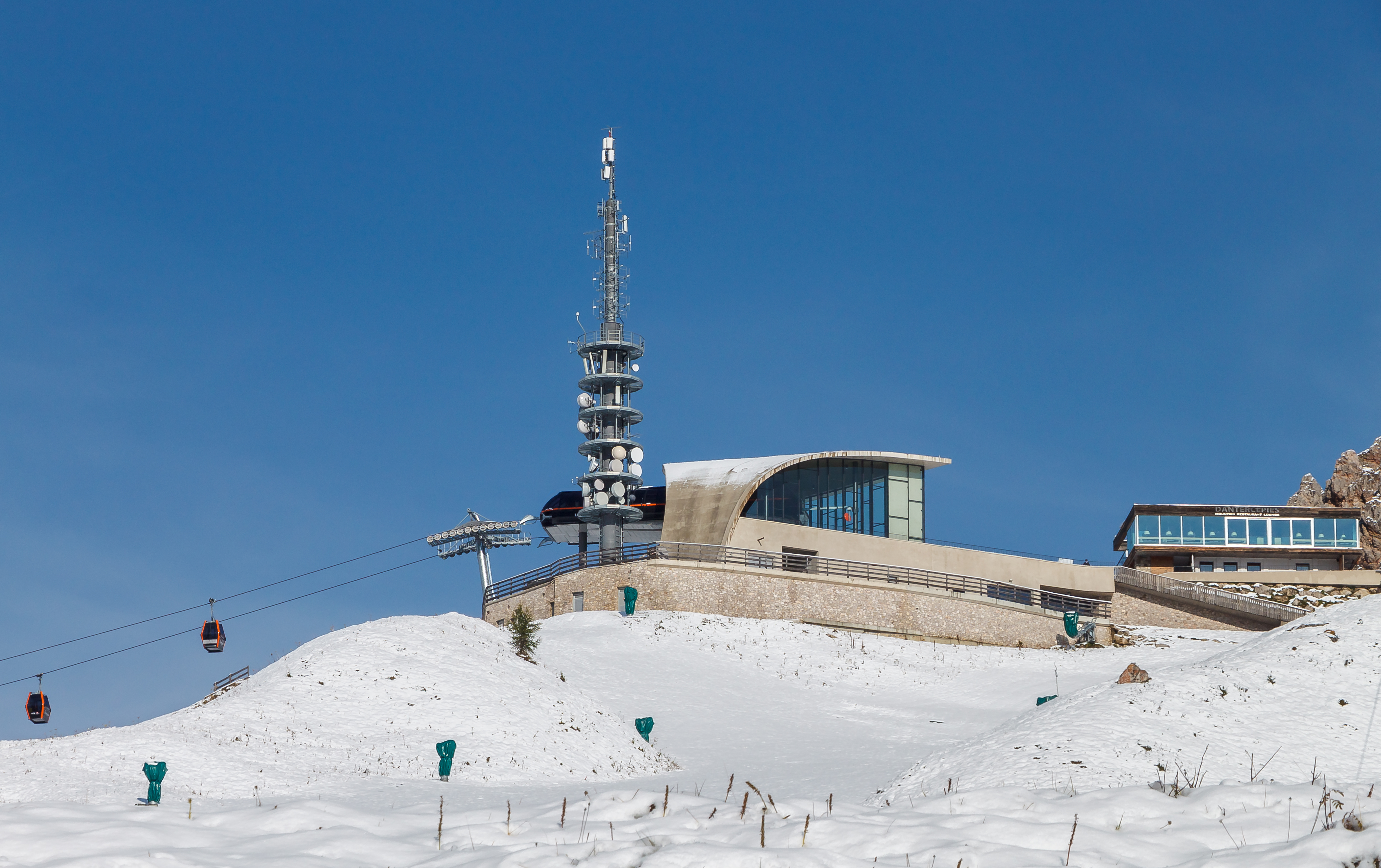 초기 강설 후 여름의 단테르체피에스 공중 케이블카 상부 종점