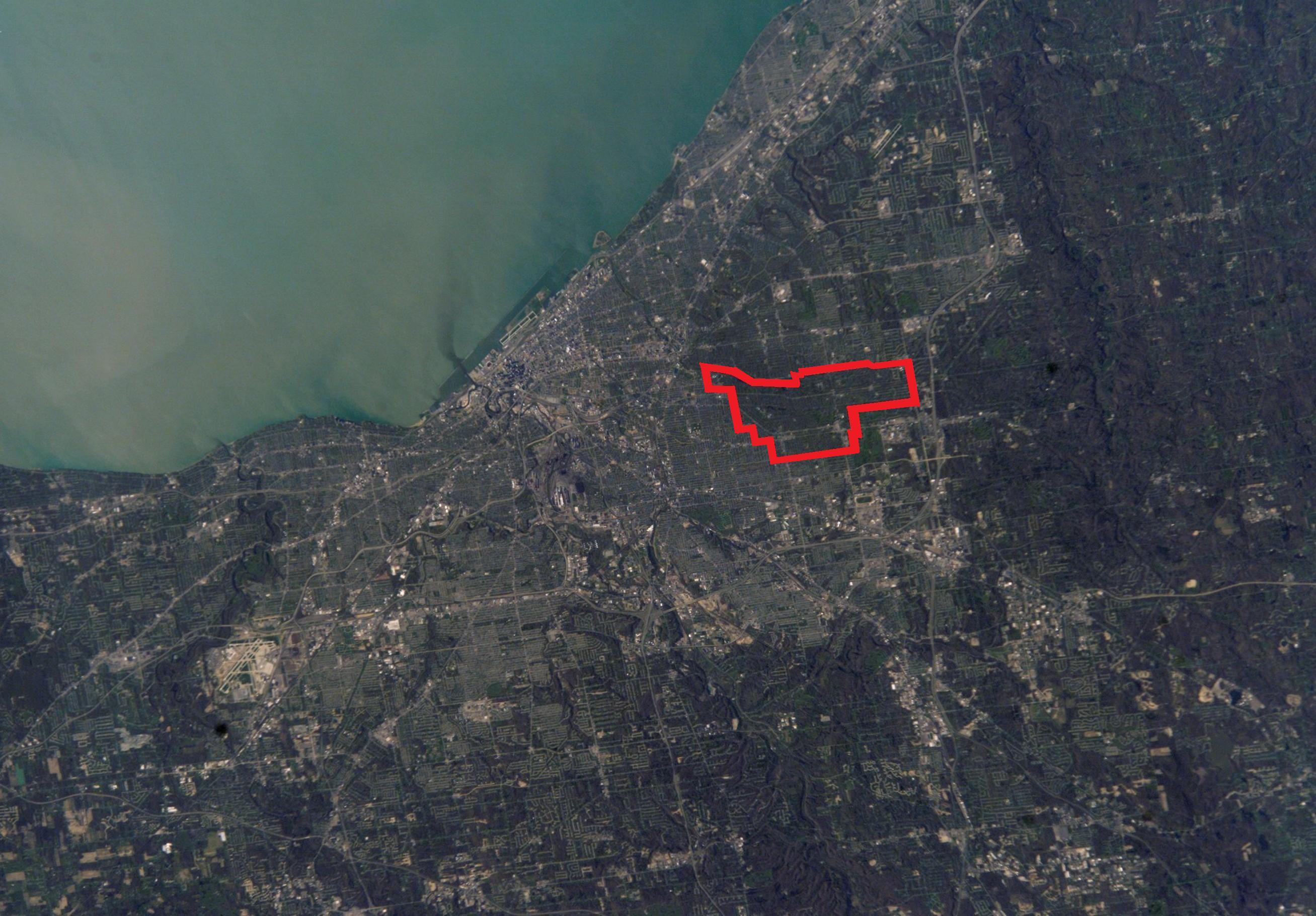 미국 항공우주국(NASA)에서 촬영한 클리블랜드 광역권 사진으로, 셰이커하이츠의 상대적인 위치를 보여준다.