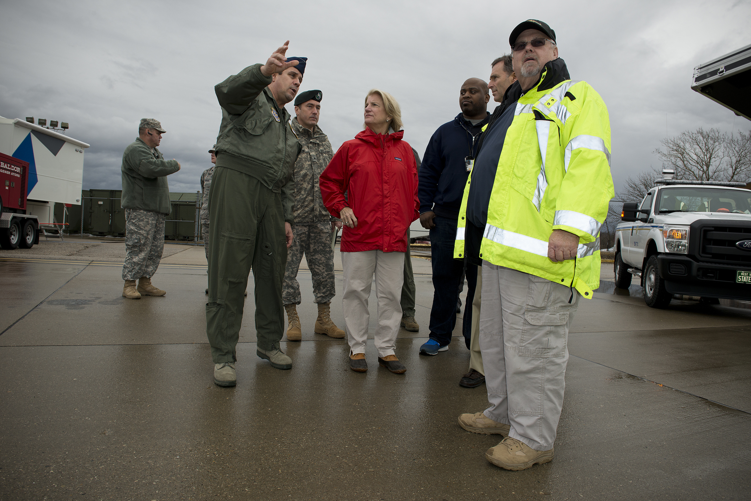 캐피토는 연방 재난 관리청(FEMA) 대표단 및 미국 공군 제롬 구힌 대령과 함께 안전한 식수를 조사한다.