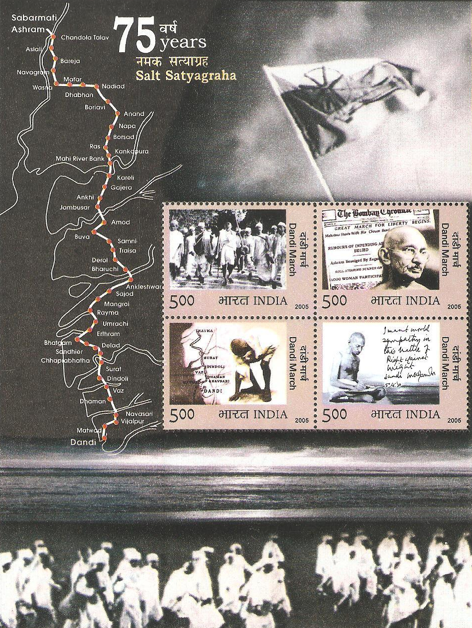 1930년 4월 6일, 마하트마 간디는 단디 해변에서 소금기 있는 진흙 덩어리를 들어 올리며 "이것으로 나는 영국 제국의 기반을 흔들고 있다"고 선언했다.[17] 그는 바닷물에 그것을 끓여 불법 소금을 만들었다. 그는 수천 명의 추종자들에게 "편리한 곳 어디에서든" 해변을 따라 소금을 만들기 시작하고, 마을 사람들에게 불법이지만 필요한 소금을 만드는 방법을 가르칠 것을 간청했다.[52]이 사건은 인도 전역에서 대규모 시민 불복종 운동을 촉발시켰다. 영국 정부는 6만 명이 넘는 사람들을 체포했지만, 소금 사티아그라하는 계속되었다.