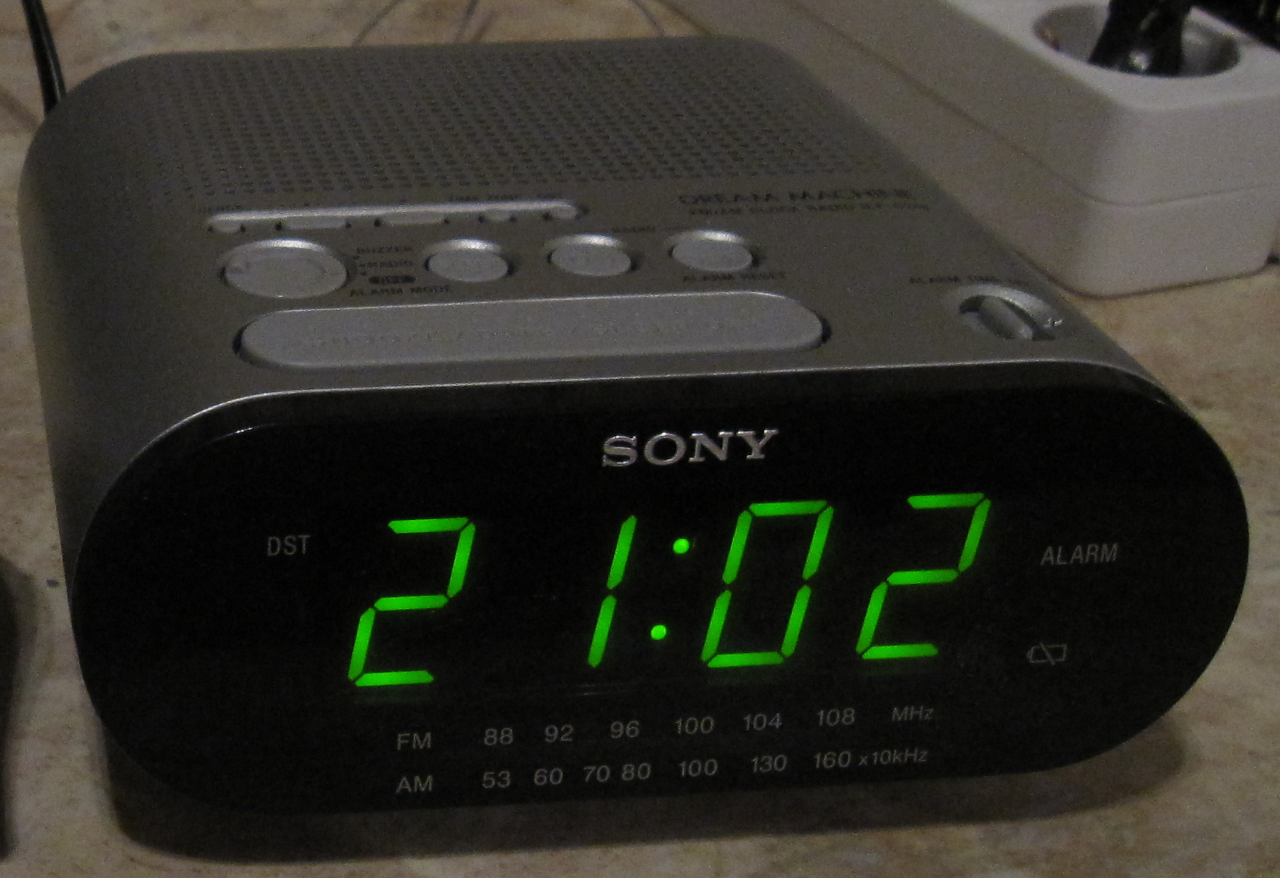 2000년대 초에 생산된 시계 라디오로, 크고 둥근 스누즈 버튼이 있으며 부저/라디오 알람 기능이 있다. AM 및 FM 대역을 지원하며, 튜너와 볼륨 조절 장치는 측면에 있다. 스누즈 버튼을 누르고 있으면 초 단위 표시를 보여준다. 발광 다이오드(LED)는 녹색이며, 12시간 시간 표시를 보여주고, 오전/오후를 나타내는 표시가 화면 왼쪽에 있다. 대부분 은색과 회색으로 제작되었으며, 사각형 본체 하단에 네 개의 짧은 '다리'가 있다. 정전 시 시간을 백업하기 위해 9V 배터리를 삽입할 수 있다.4. 14. ICF-C492