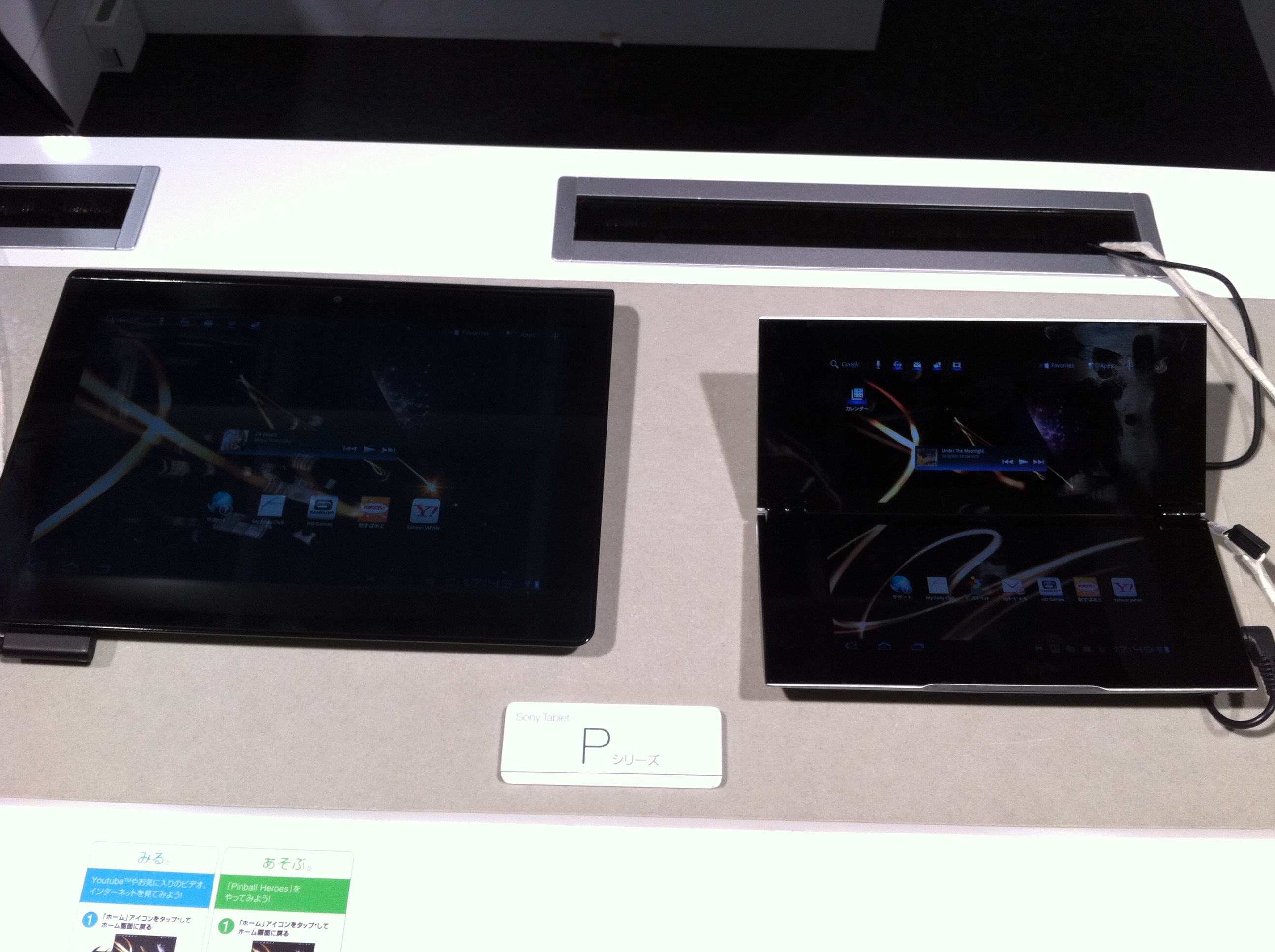 소니 태블릿 P | SGPT211JP/S (Wi-Fi+3G) SGPT213JP/H (Wi-Fi) | 컬러 TFT 액정 5.5인치×2 (1024×480 px) | IEEE802.11 b/g/n (Wi-Fi 모델·Wi-Fi+3G 모델) HSDPA·HSUPA (Wi-Fi+3G 모델만) | 폴더블형 | 500만 화소 CMOS (후면) 30만 화소 CMOS (전면) | 4GB (Wi-Fi 모델·Wi-Fi+3G 모델) | Android 3.2 (Wi-Fi 모델·Wi-Fi+3G 모델) | Android 4.0.3으로 업데이트 가능 |