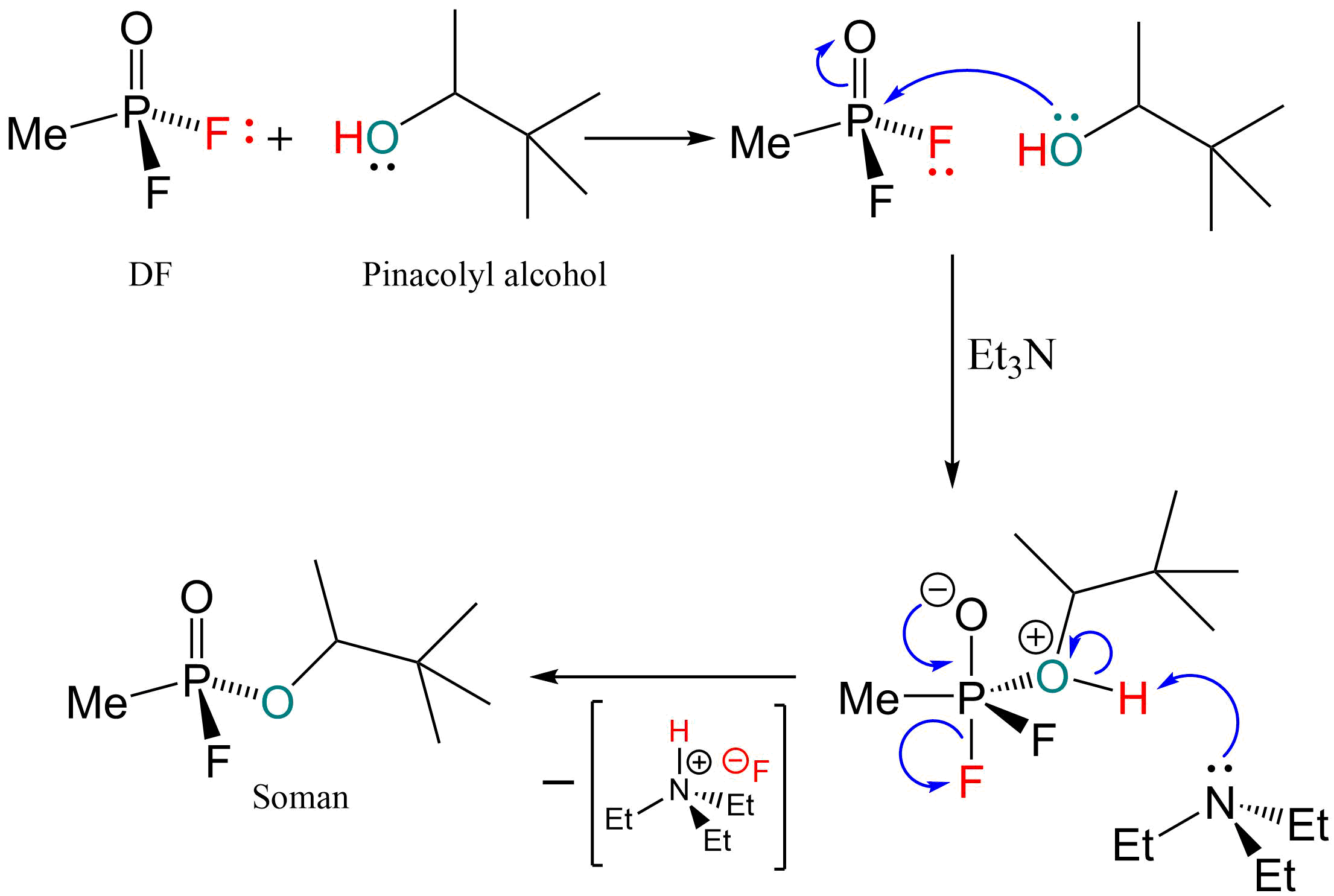 소만 제조 과정은 사린 제조 과정과 매우 유사하며, 아이소프로판올 대신 피나콜릴 알코올을 사용한다.