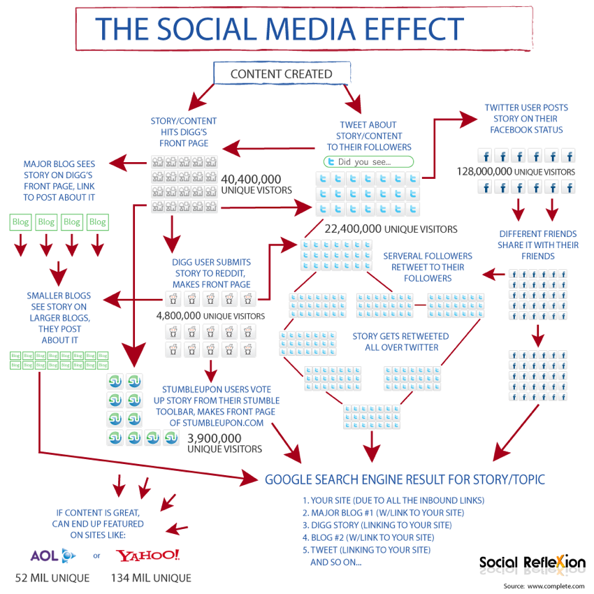 소셜 미디어를 통한 콘텐츠 및 링크 공유의 흐름과 확산은 더 큰 검색 엔진 최적화로 이어진다.