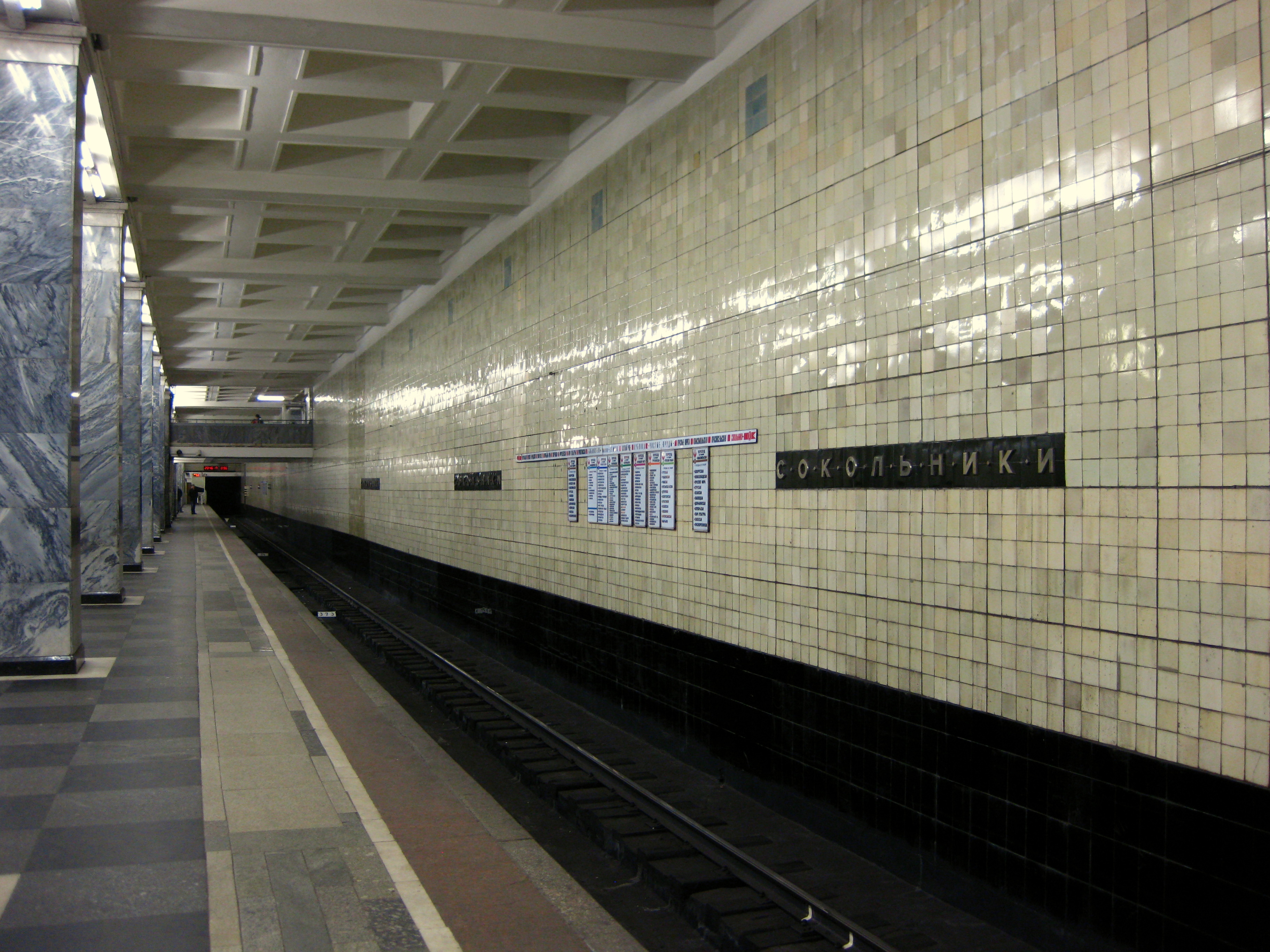 소콜니키역은 모스크바 지하철 소콜니체스카야 선의 역으로, 1935년 5월 15일에 개통되었다. 이 역은 건축가 이반 타라노프와 나데즈다 비코바에 의해 설계되었으며, 회색과 청록색 타일로 내부가 디자인되었다. 소콜니키 역은 1937년 파리 국제박람회에서 대상을 수상했으며, 1965년 프레오브라젠스카야 광장까지 노선이 연장되기 전까지 30년 동안 노선의 동쪽 종착역이었다.