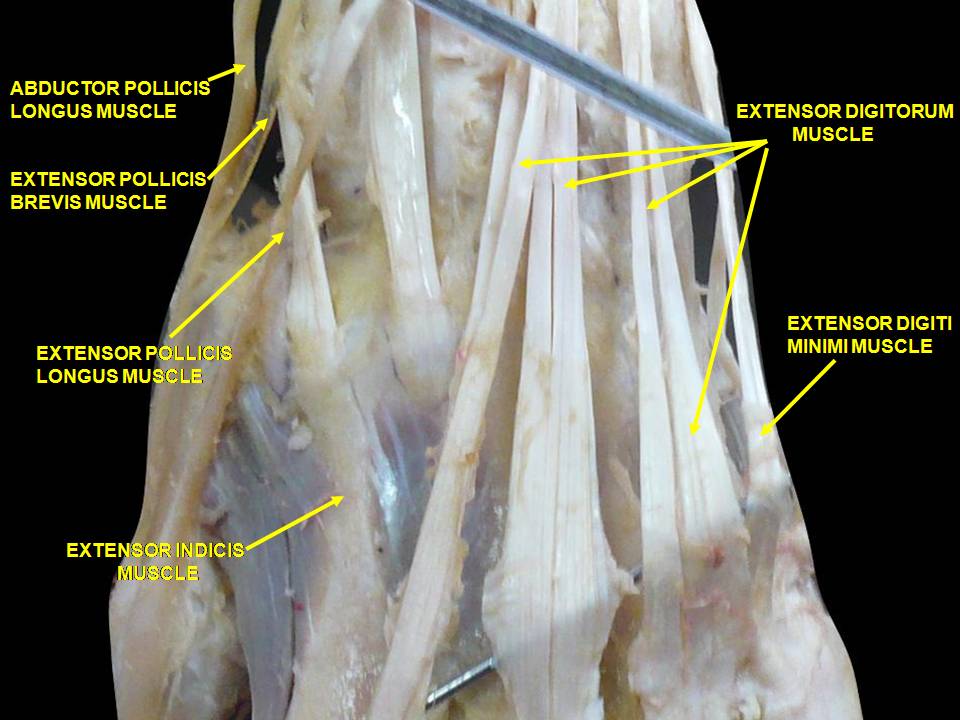 첫 번째 손가락 사이 관절 맞은편에서 이 널힘줄은 세 개의 갈래, 즉 중간 갈래와 두 개의 측부 갈래로 나뉜다. 중간 갈래는 두 번째 손가락뼈의 바닥에 삽입되고, 두 개의 측부 갈래는 두 번째 손가락뼈의 측면을 따라 이어져 인접한 가장자리로 합쳐져 마지막 손가락뼈의 등쪽 표면에 삽입된다. 힘줄이 손가락 사이 관절을 가로지를 때 등쪽 인대를 제공한다. 집게손가락으로 가는 힘줄은 고유 손가락 폄근의 힘줄과 함께 가는데, 이는 자뼈 쪽으로 위치한다. 손등에서 가운데, 넷째, 다섯째 손가락으로 가는 힘줄은 두 개의 비스듬한 띠(힘줄사이연결)로 연결되는데, 하나는 세 번째 힘줄에서 나와 두 번째 힘줄 아래 및 가쪽으로 지나가고, 다른 하나는 같은 힘줄에서 나와 네 번째 힘줄 아래 및 안쪽으로 지나간다.[4]