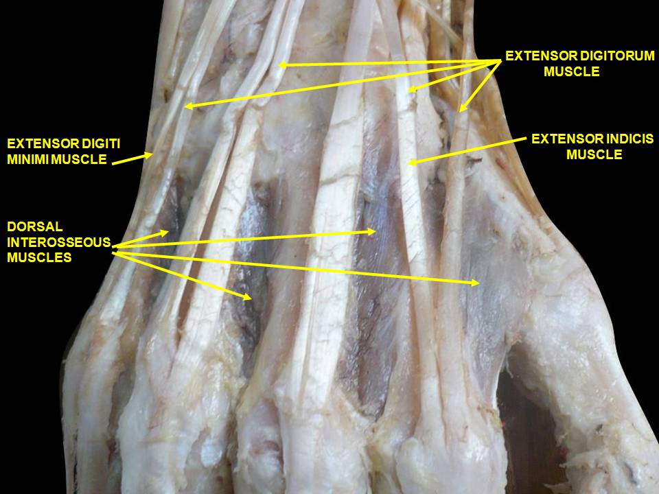 손허리손가락관절의 반대편에서 각 힘줄은 곁인대와 붙어 있으며, 손허리손가락관절의 등쪽인대 역할을 한다. 힘줄이 손허리손가락관절을 가로지른 뒤, 넓은 널힘줄이 되면서 몸쪽손가락뼈의 손등쪽 면을 덮는다. 또한 이 널힘줄은 뼈사이근벌레근으로 인해 보다 더 튼튼해진다.[10]