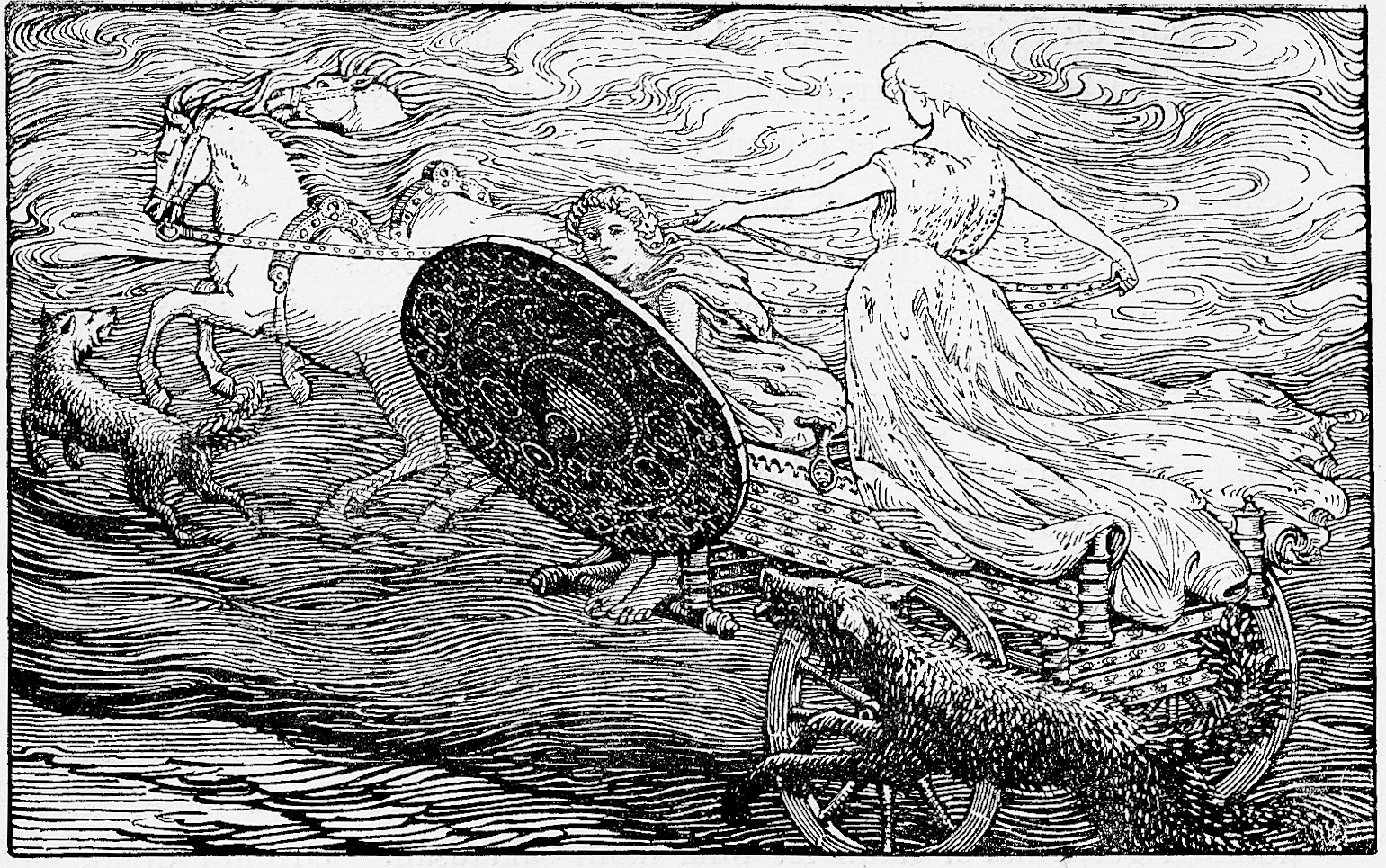 풀무 가 달려 있다. - 태양은 항상 스코르라는 늑대에게 쫓기고 있기 때문에, 서둘러 운행해야 한다.