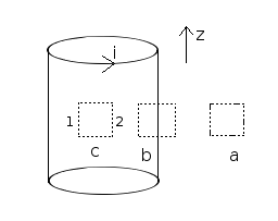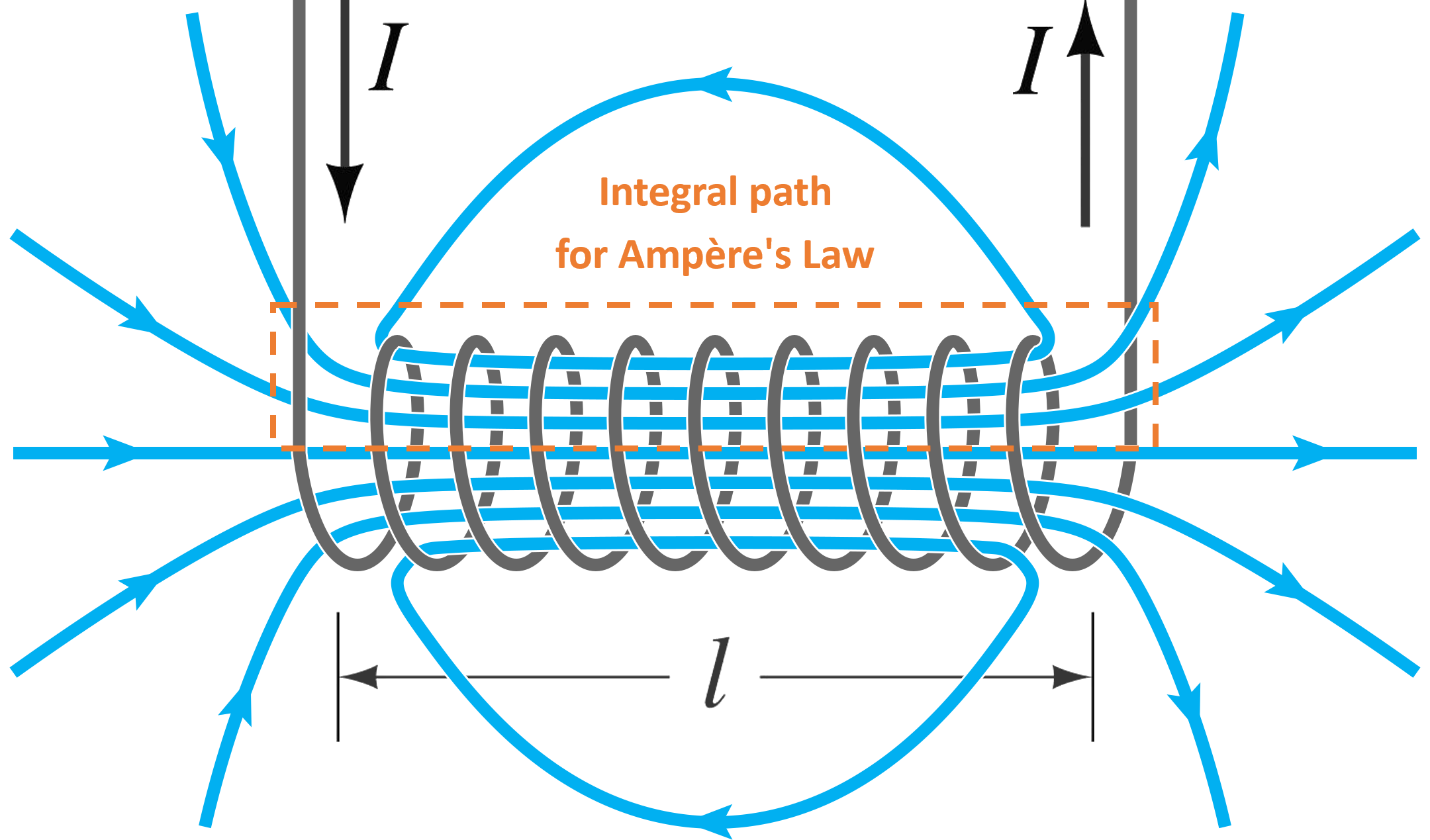 옆의 그림에서 b의 앙페르 고리에서 앙페르의 법칙을 사용하면 직사각형의 윗변과 아랫변에서는 자기장의 방향과 적분 방향이 수직하므로 적분값이 0이고, 오른쪽 변에서는 자기장이 0이므로 적분값도 0이다. 결과적으로 직사각형의 왼쪽 변의 길이를 l이라고 하면 앙페르의 법칙에 의해