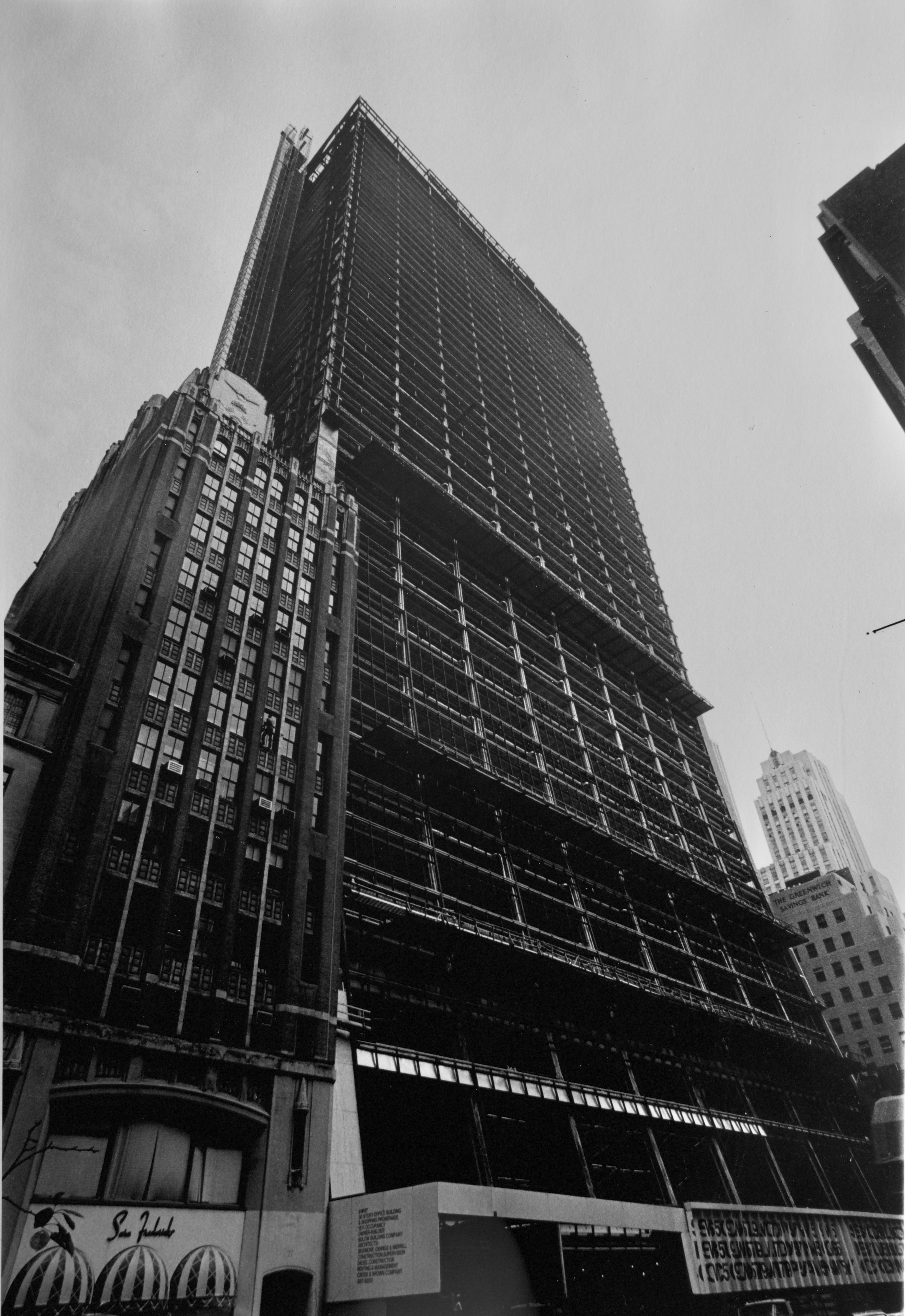 1969년 초, 솔로우가 30–34 West 58번가의 부지를 매입하여 개발을 위한 연속적인 부지를 확보하면서 부지 철거가 시작되었다. 그 결과, 제안된 건물은 다시 설계되었다.[50] 1970년 초, 솔로우는 50층 규모의 사무실 건물에 1.5e6ft2이 포함될 것이라고 발표했으며, 이 중 3분의 1은 에이본이 임대했다.[55][56] 그해 4월까지 에이본은 25개 층에 걸쳐 약 65032.13m2 규모로 공간을 늘렸다.[57] 골판지 약 85.34m 간판이 공사 현장 앞에 세워졌다. 한 각도에서는 "솔로우 빌딩 컴퍼니"라고, 다른 각도에서는 "9 W 57"이라고 읽히도록 설계되었다.[19] 그해 10월까지 철골 공사가 8층에 도달했다.[13] 건설 중 크레인이 떨어져 5명의 작업자가 부상을 입었고,[58] 2명의 전기 기술자가 엘리베이터 통로에서 추락하여 사망했다.[59][60] 건물은 1971년 6월에 탑핑 아웃되었다. 앤 힐리(Anne Healy)는 탑핑 아웃 행사를 위해 7층 높이의 화살촉 한 쌍을 디자인했다.[61]