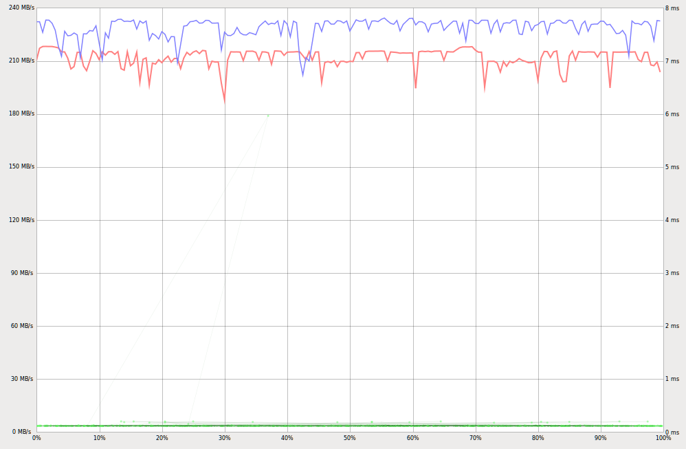 순차 접근 성능 | 소비자용 SSD는 모델에 따라 200MB/s에서 3500MB/s 사이의 전송 속도를 제공한다.[30] | HDD는 디스크의 회전 속도 및 데이터 위치에 따라 약 200MB/s로 데이터를 전송한다. 외부 트랙은 더 빠른 전송 속도를 허용한다.[31] |