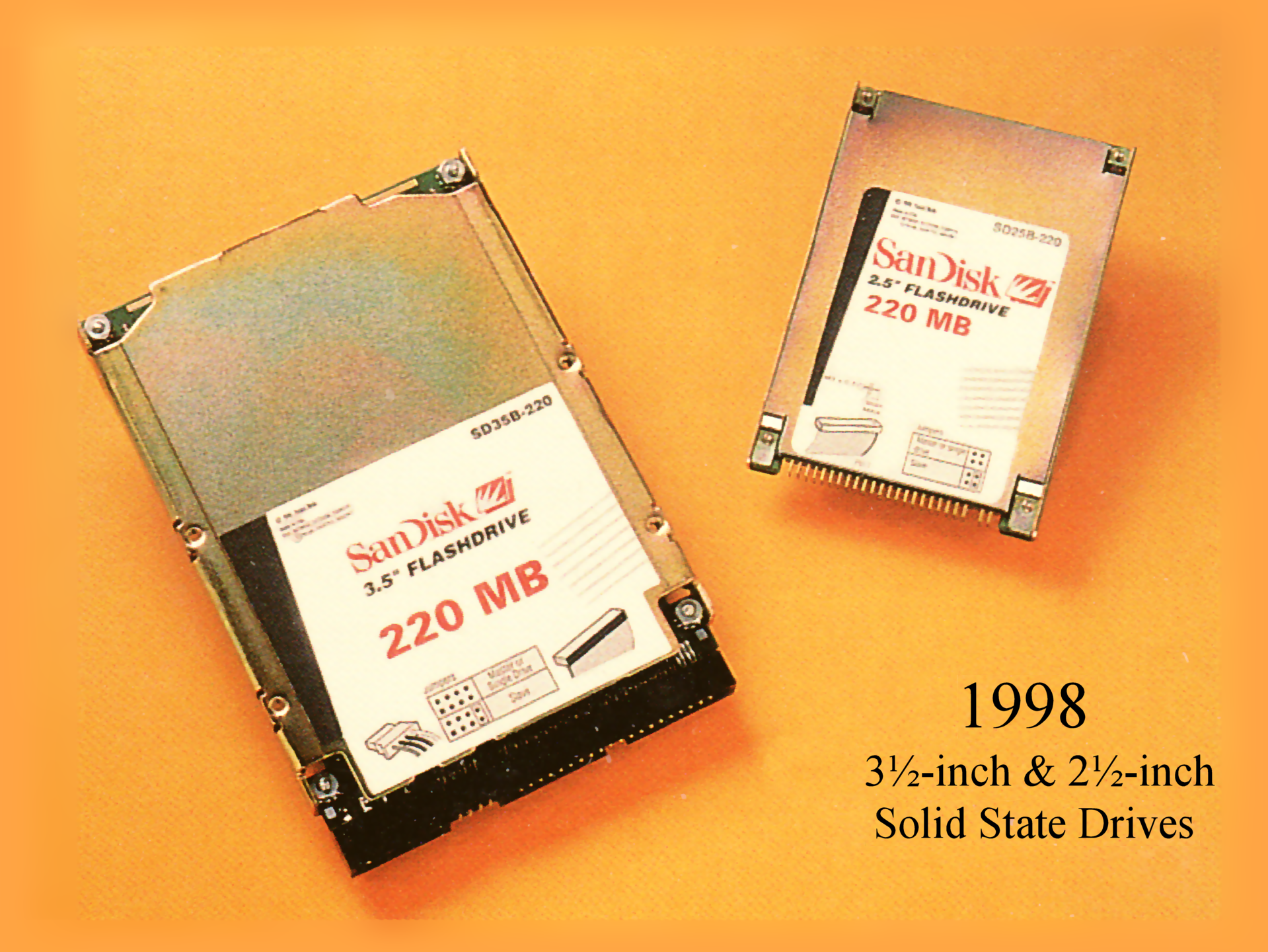 현대 SSD의 핵심 기술인 플래시 메모리는 1980년 도시바의 마수오카 후지오가 발명했다.[128][129] 플래시 메모리 기반 SSD는 1989년 샌디스크(SanDisk)의 설립자들이 특허를 받았고,[130] 1991년 IBM의 씽크패드(ThinkPad) 펜 컴퓨터용으로 20MB 용량의 ATA 호환 SSD를 개발하고 출시하며 상업화되었다.[242][243][131] 이 SSD의 OEM 가격은 약 1000USD (MB당 50달러)로 매우 비쌌지만,[132][243] 기존 하드 디스크 드라이브(HDD)를 대체하는 플래시 메모리 시대를 여는 신호탄이 되었다. 샌디스크는 메모리 셀 하나에 여러 비트를 저장하는 멀티 레벨 기술과 컨트롤러 기술을 이용해 기존 저장 매체를 모방하는 "시스템 플래시" 개념을 내세웠다.[243] 같은 해인 1989년, Psion MC 400 노트북 컴퓨터는 플래시 기반 "솔리드 스테이트 디스크" 카드 형태의 이동식 스토리지를 위한 슬롯 4개를 탑재했다.[282]